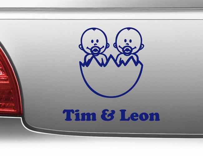Zuckersüß und im Doppelpack: Autoaufkleber "Egg Brothers". Unser Motiv zeigt ein Zwillingspärchen samt Nuckel sitzend in einer Eierschale. Der verspielt, muntere und absolut fröhliche Blick der Baby's, sorgt für Begeisterung bei Jung und Alt. Im Comicstil gehalten werden sie zu einer kreativen und intensiven Dekoration an Deinem Wagen – mit genügend Platz für einen Namen Deiner Wahl. Garantiert die beste Wahl z.B. für die Heckklappe.