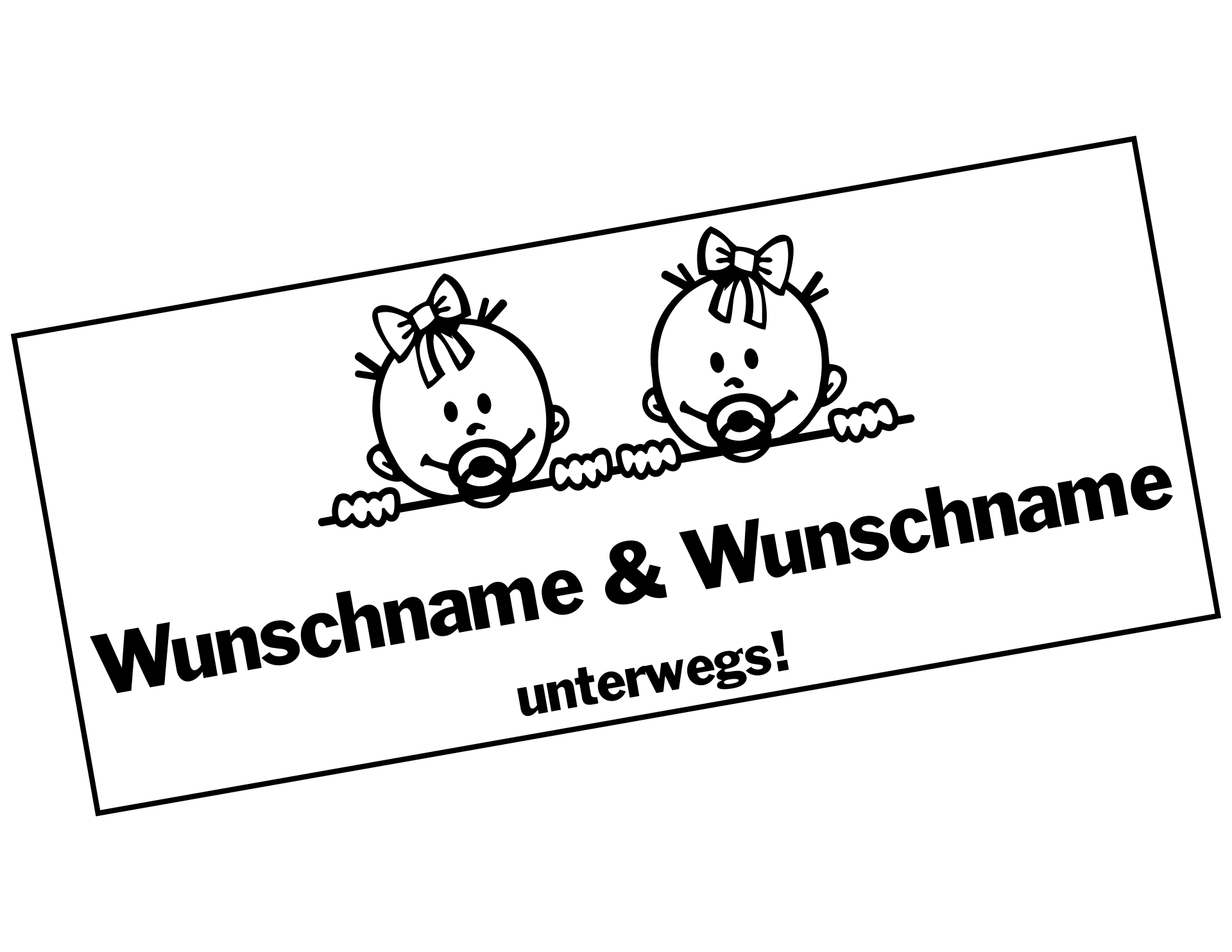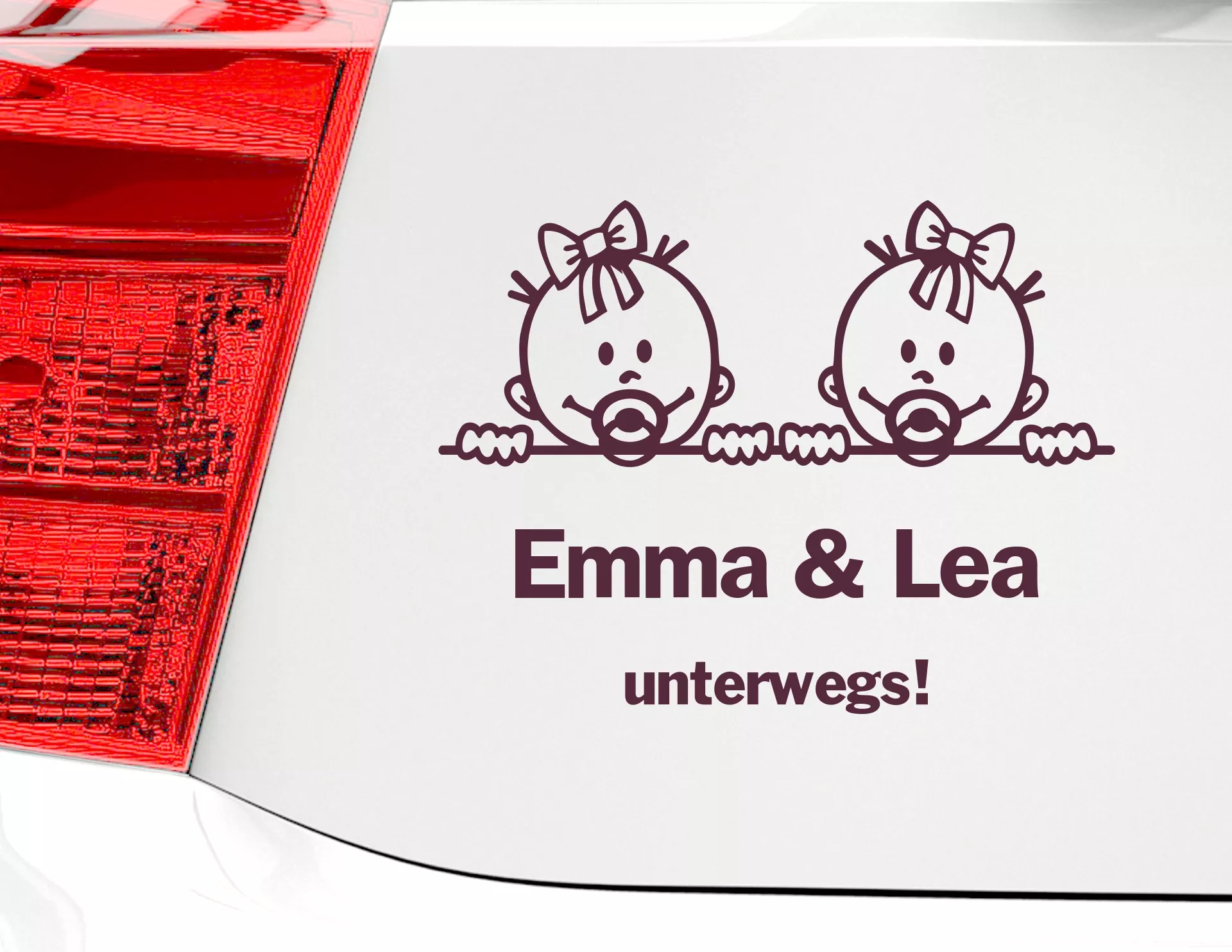 Doppelte Freude, doppeltes Glück… Autoaufkleber "Happy Girl Twins". Unser Zwillingspärchen kommt gleich im Doppelpack und bietet neben feinen Details auch ausreichend Platz für zwei Namen nach Wahl. Somit wird dieses Design zu einem echten Hingucker an Deinem Wagen. Die niedlichen Babyfiguren samt Schnuller und Schleifchen im Haar, werden alle Blicke auf sich ziehen und jeden Betrachter begeistern.