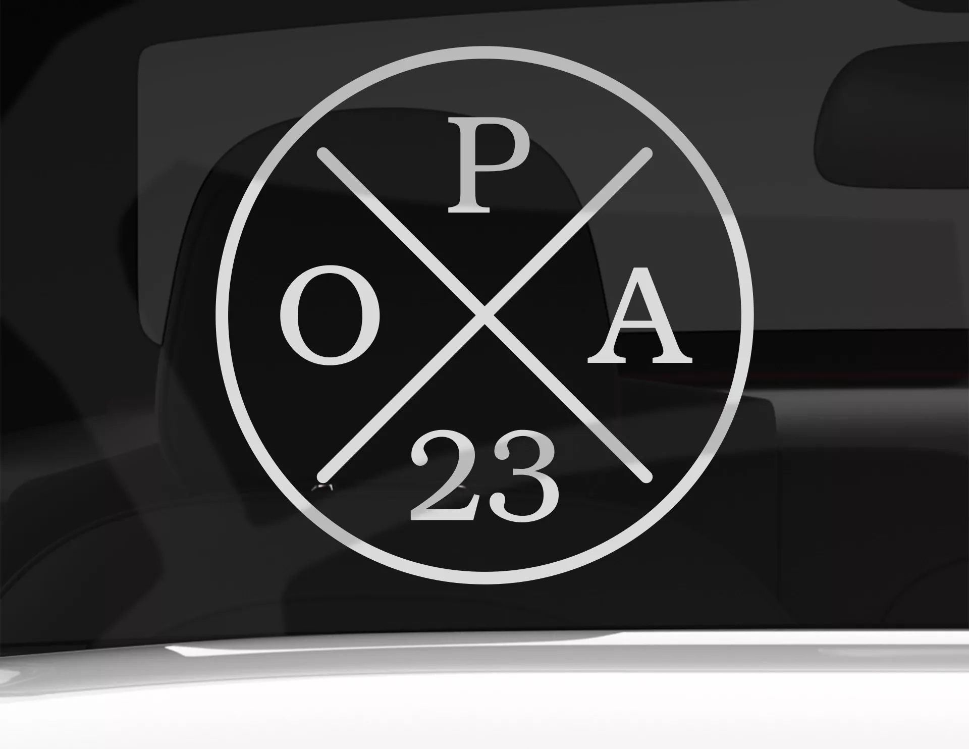 Autoaufkleber Opa Circle Cross für (werdende) Opas mit schlichter Eleganz, zurückhaltendem Design, stilsicher und sehr modern. In den runden Aufkleber kann das Geburtsjahr des (Enkel-) Kindes ganz individuell eingetragen werden.