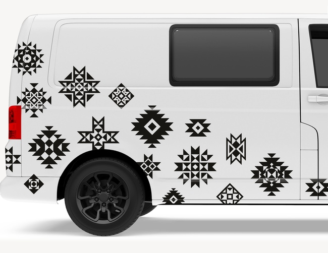 Beim Reisen zum Entdecker werden: Als Design für das perfekte Urlaubsgefährt kann dieses DIY-Motiv wahre Wunder bewirken. Autoaufkleber Azteken Musterrausch – mit vielen geometrischen Elementen und Sternen zur freien Montage.