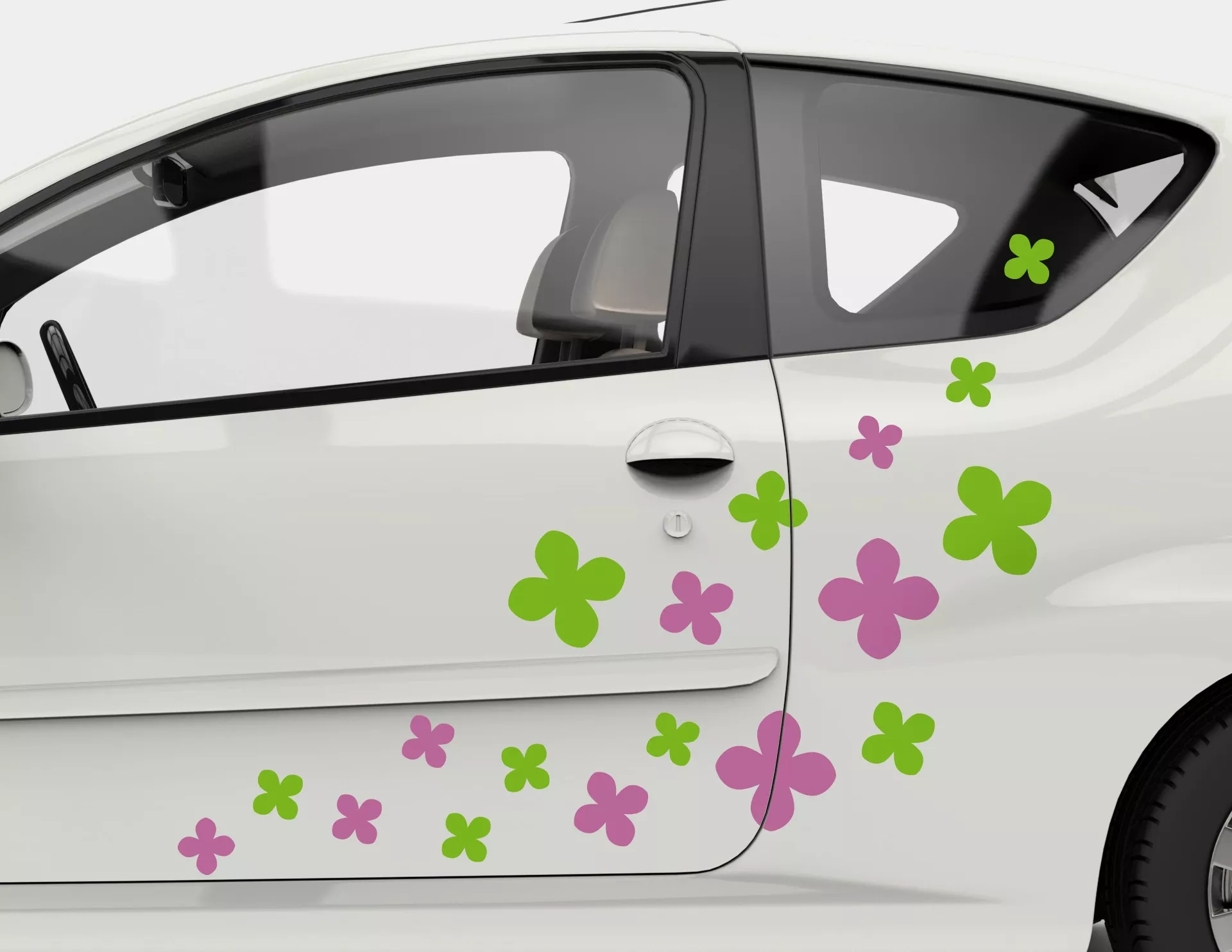 Unser Tipp: Vor dem Verkleben alle Blüten einzeln mit dem Trägerpapier ausschneiden und erstmal grob verteilen. Dabei mit Malerkrepp auf dem Auto leicht fixieren. So kannst Du Dich Schritt für Schritt an die beste Positionierung Deiner Blüten heranarbeiten. Am Ende das Trägerpapier lösen und die Autoaufkleber anbringen.
