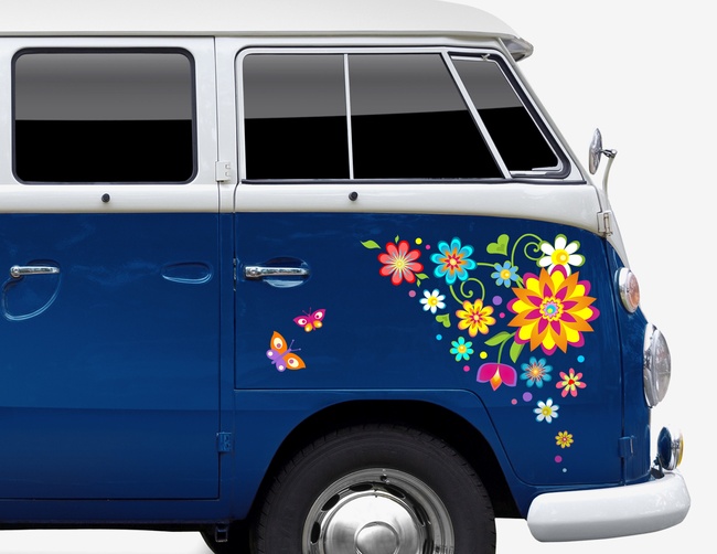 Alle reden von grünen Automobilen; hier kommt die geballte Blumenkraft! Autoaufkleber Daisy's Flower Corner mit voller "Flower Power" á la Woodstock.