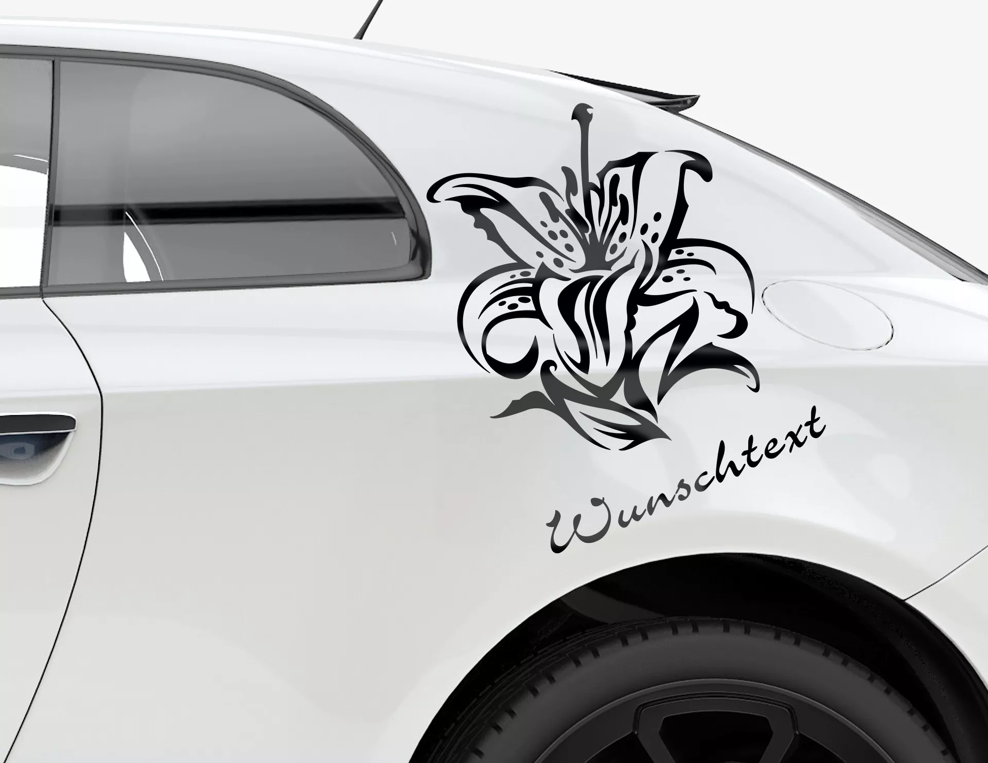 Verzaubere Dein Auto mit der Eleganz der Lilie. Der Autoaufkleber Deine Lilienblüte, enthält eine kunstvoll gestaltete Lilie + Deinen Wunschtext.