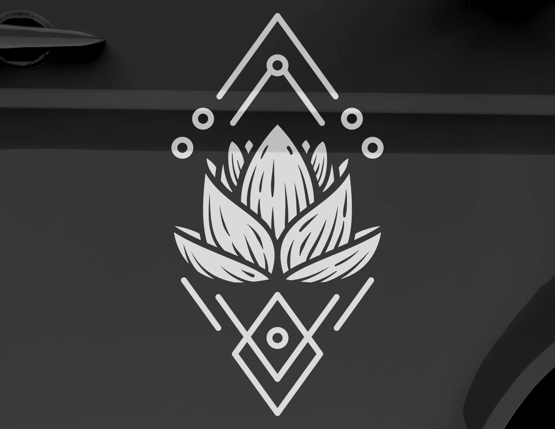 Florales Formenspiel: Eine moderne Komposition aus Lotos-Blüte, Linien, Rauten und geometrisch Formen. Gefühlvoll, spirituell und mit viel guter Energie, unser Autoaufkleber Geolotus.
