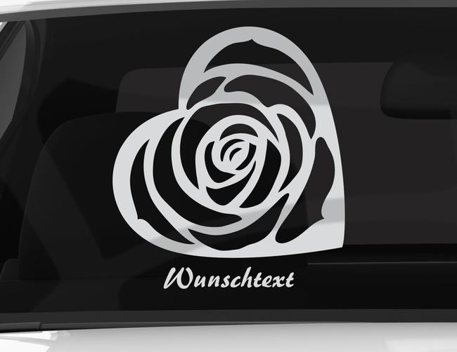 Romantik pur vermittelt dieses Motiv, das eine Rosenblüte und ein Herz verschmelzen lässt. Der Autosticker kann mit einem Wunschtext ergänzt werden und ist dann eine schöne Erinnerung an den Jahrestag, Hochzeitstag oder einen anderen schönen Anlass. Einfach auf Heckscheibe, Tür oder Motorhaube aufkleben und romantisch unterwegs sein!