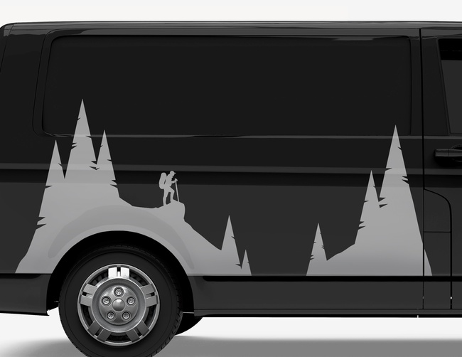 Über Berge und durch Täler, durch Kiefer-, Fichten- und Pinien-Wälder hindurch – Wandern ist eines der schönsten Outdoor-Hobbys. Für Hiking-Fans gibt es deshalb den Aufkleber für Caravan, Camper oder Wohnwagen mit moderner Berg-Wald-Silhouette. Als alpines Design ziert das grafische Panorama dann das Autoblech und macht direkt Lust auf die nächste Wandertour.