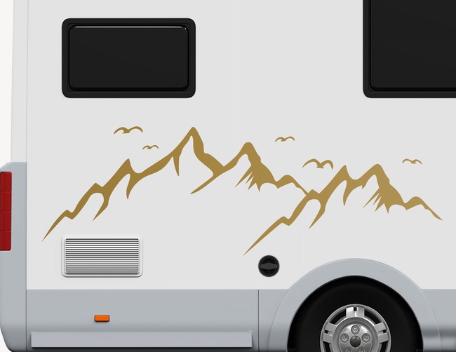 Majestätische Höhen rufen: Unser Autoaufkleber Mountains & Birds bringt die atemberaubende Schönheit der Berge direkt auf Deinen Caravan, Bus oder Camper. Mit der Silhouette dieser imposanten Bergkette und einem fliegenden Vogelschwarm.