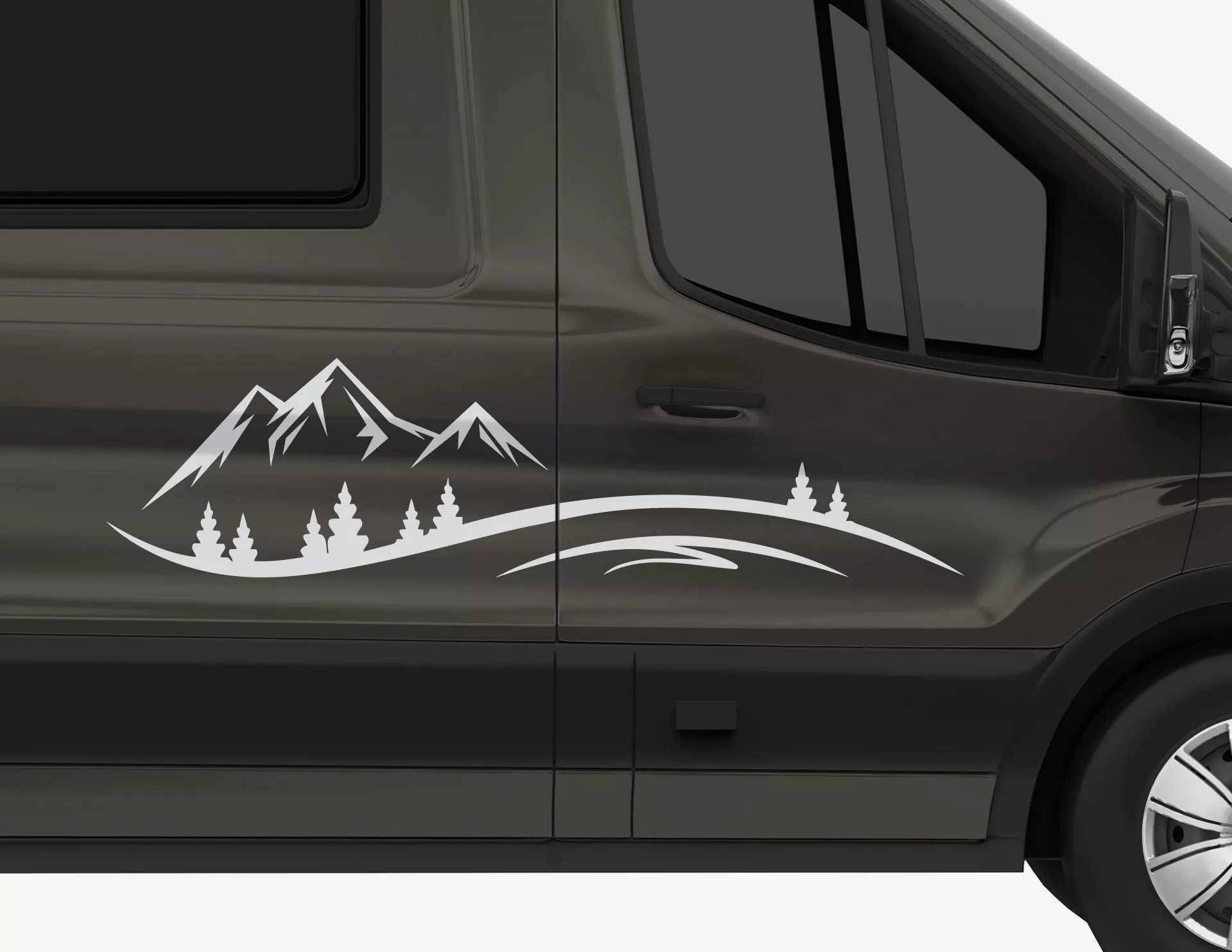 Frische Luft, wilde Natur, einen exklusiven Panoramablick und die passende Deko für Dein Reisemobil gibt es hier: Ein Design mit reduzierter Bergszenerie und organisch verlaufenden Streifen – unser Autoaufkleber Ruf der Berge.