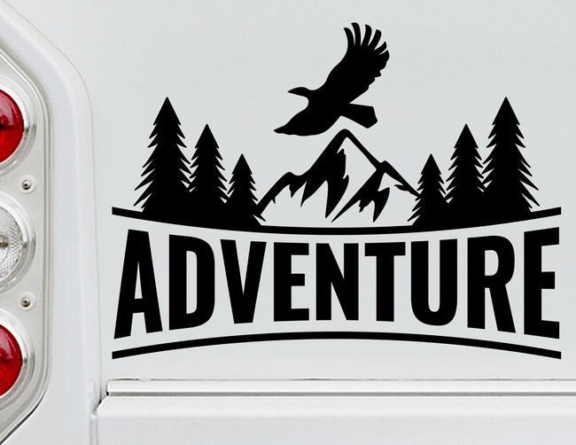 Das Abenteuer ruf: Autoaufkleber "Adventure is Calling" für Aktiv-Urlauber, Camping-Freunde oder Trekking-Fans – mit coolem Schriftzug, Bergen, Nadelbäumen und einem Adler im Flug.
