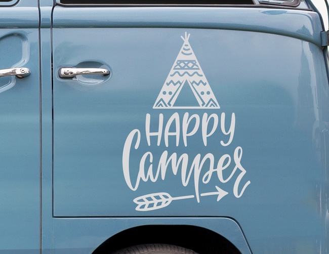 'Happy Camper' kennen die Begeisterung, die die Zeit im Zelt, Wohnwagen oder Campingmobil auslöst – draußen sein, direkt in der Natur und zusammen mit anderen Camping-Fans ist einfach entspannend. Dieser Motiv-Aufkleber macht sich nicht nur am Caravan gut. Wer ein echter Camper ist, möchte das schließlich auch an seinem Alltagsgefährt zeigen, z.B. an der Heckklappe oder den Türen. Autoaufkleber "Happy Camper": Ein kreatives Design mit einem Schriftzug im Handlettering-Stil samt Tipi-Zelt und Pfeil.