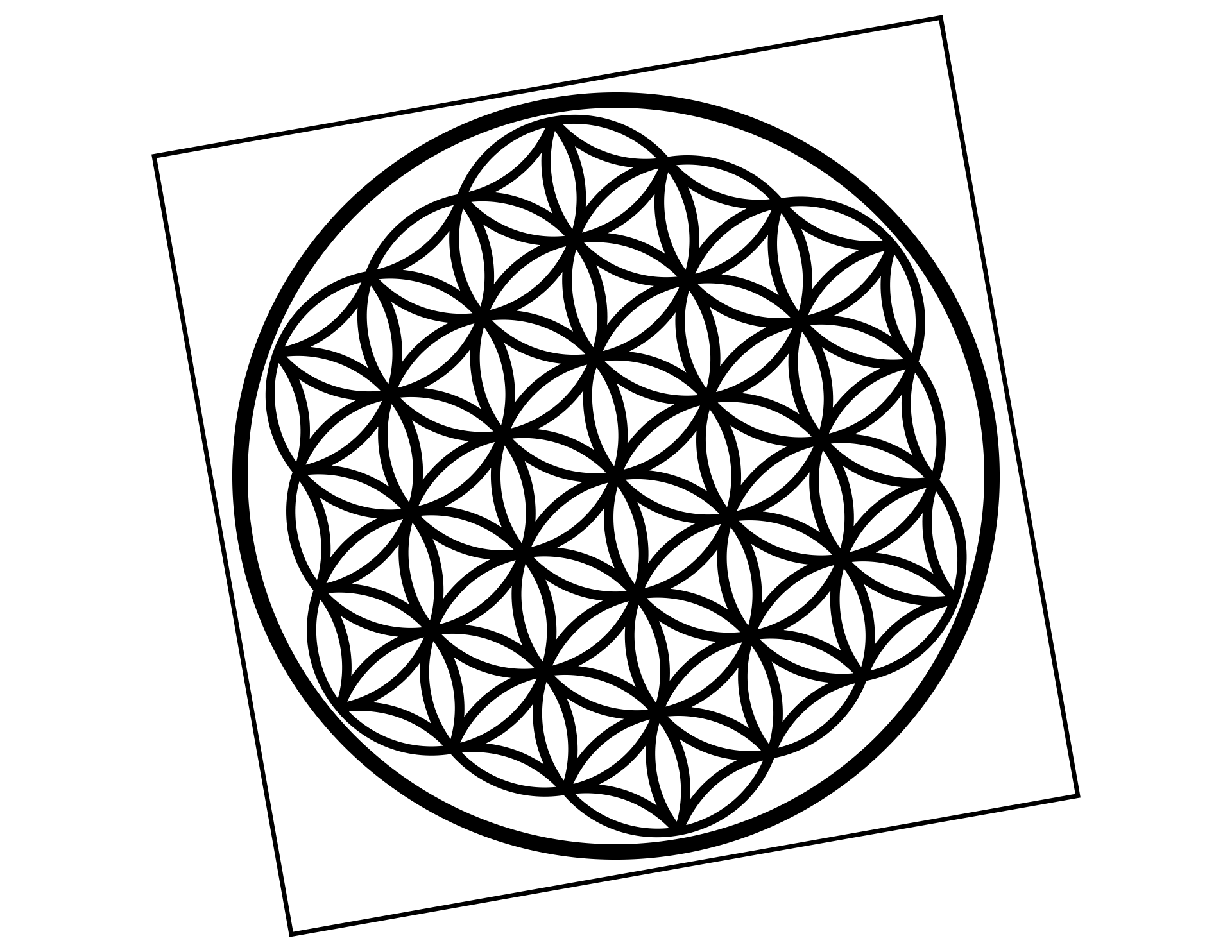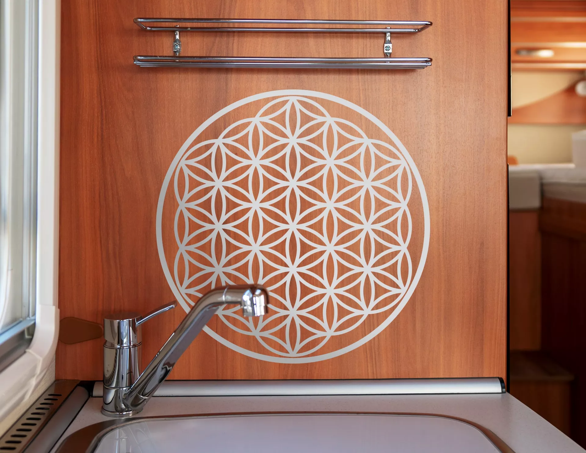 Auf den ersten Blick könnte es sich um eine Blume handeln – auf den zweiten Blick sieht man 19 ineinander verschlungene Kreise in einem Sechseck, die an ihren Schneidepunkten durch sogenannte Linsen verbunden sind – umschlossen von einem Kreis, der das gleichmäßige Gitter zusammen hält. Und wer sich nach einer langen Road-Tour verspannt und erschöpft fühlt, findet in diesem Symbol; Schutz, Harmonie und Lebensenergie. Ein geometrisches Kraft-Design das für Balance sorgt und welches wir auf einer erlebnisreichen Ferien-Reise in die Natur gut gebrauchen können, perfekt z.B. für den Camping-Bus, Wohnwagen, Caravan oder Yogamobil.