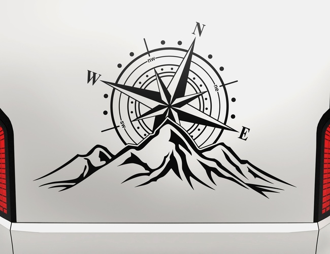 Über diesen Bergen geht keine Sonne auf, sondern ein detaillierter Kompass mit integrierter Windrose, Stricheinteilung und Himmelsrichtungen. Dieser ist ein Symbol für Freiheit und Abenteuerlust. Zusammen ergeben alle Elemente einen Aufkleber z.B. für Caravan oder Wohnmobil, der die Sehnsucht nach der nächsten Reise perfekt zum Ausdruck bringt. Ein Autoaufkleber für Outdoor-Freunde und Camping-Fans.