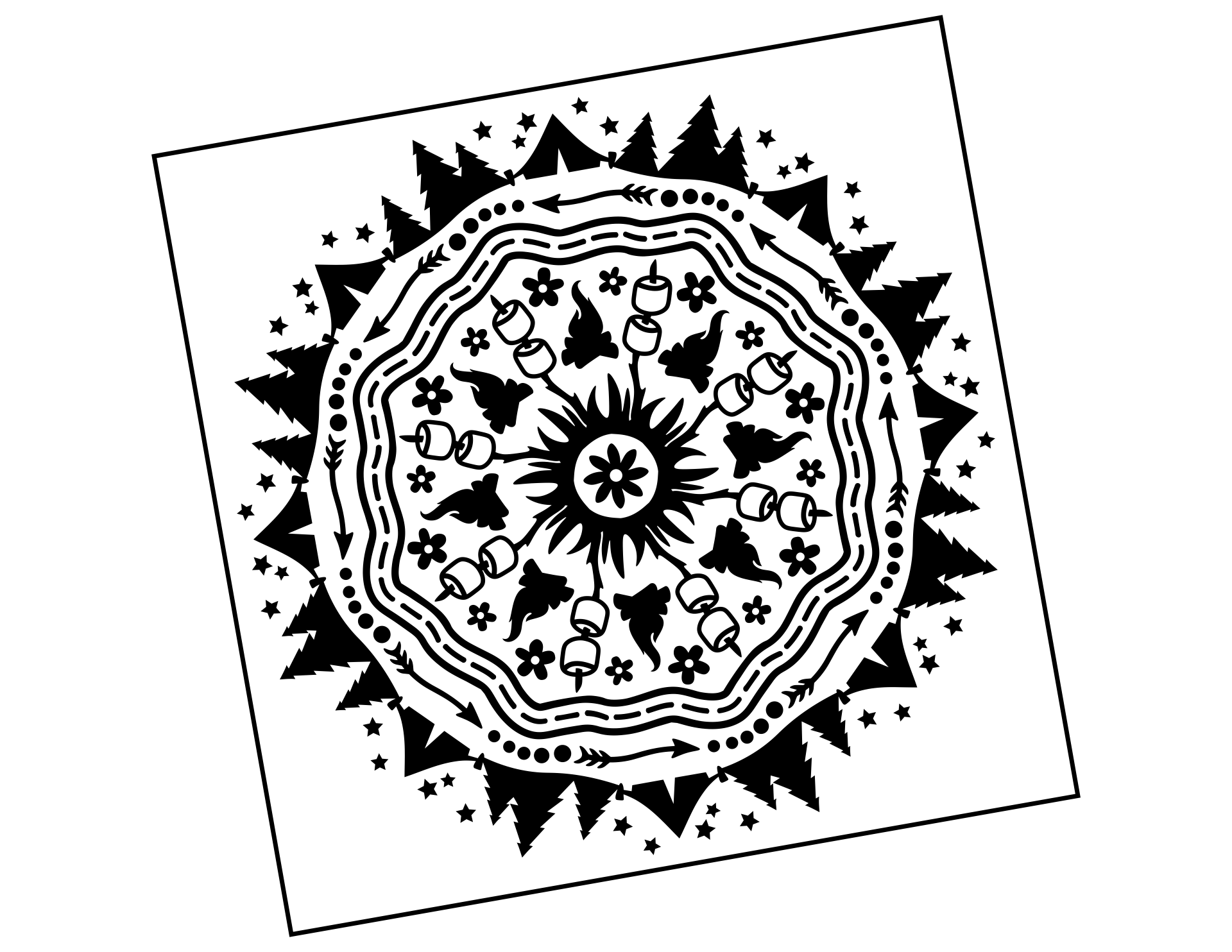 Ein Mandala nach unserem Geschmack: statt fernöstlichen Mustern und Formen zeigt dieses kreisrunde Mandala zum Aufkleben die schönsten Seiten des Campings: Zelten im Wald, Lagerfeuer, dazu Marshmallows und die Erholung in der Natur. Ein wirklich besonderes Aufkleber-Design für alle Outdoor-Fans.