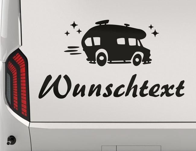 Camping: getreu dem Motto "zurück zur Natur"! Das ist mit einem Wohnmobil, Camper, Bus oder Caravan jederzeit möglich. Hinfahren wo es schön ist, neue Orte entdecken und das Leben genießen. So fühlt sich Freiheit auf Rädern an. Um dem auch Ausdruck zu verleihen, einfach diesen illustrierten Motiv-Sticker samt vieler Sterne auf Dein Fahrzeug kleben und mit einem Wunschnamen personalisieren: Autoaufkleber Dein Wohnmobil auf Tour!