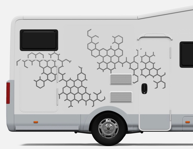 Diese molekulare Struktur mit durchbrochenen Gittern ist ein Car Decal, dass man immer wieder betrachten möchte. Die Sechsecke sind nämlich ein echter Blickfang und sowohl auf Wohnmobilen, Vans wie auch auf Bussen ein cooles grafisches Element.