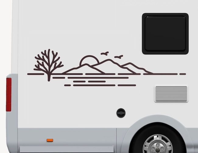 Natur auf ganzer Linie: Dieser Aufkleber zeigt, wie einfach Schön sein kann. Baum, Berge, Sonne, Wasser – minimalistische Linienkunst im Icon-Stil für ein zeitloses Design auf Caravan und Campingmobil.