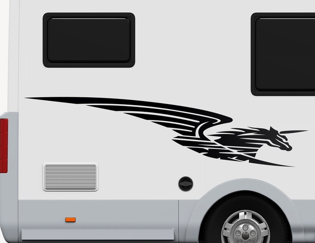 Legendär ist das geflügelte Pferd aus der griechischen Mythologie, das als Pegasus bekannt wurde. Wem die Eleganz und Bewegung des Pegasus gefällt, kann Camper, Wohnmobil, Bus & Co. mit diesem Sticker verzieren. Die gestreckte Form des Aufklebers und die Dynamik der Flügel machen aus jedem Caravan einen stylischen Hingucker - unser Autoaufkleber Power of Pegasus.