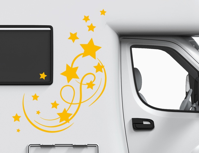 Unter freiem Himmel! Gerade in der Natur, auf Campingplätzen weit entfernt von großen Städten, kann man den nächtlichen Himmel besonders gut beobachten. Wer davon nicht genug bekommt, kann mit dem Autoaufkleber Sternenfunkeln den Caravan, Van oder Wohnwagen themenrecht verzieren. Mit vielen Sternen, Sternschnuppen samt Schweif und schön geschwungenen Linien – verleiht dieses Design jedem Fahrzeug ein galaktisch-cooles Aussehen.