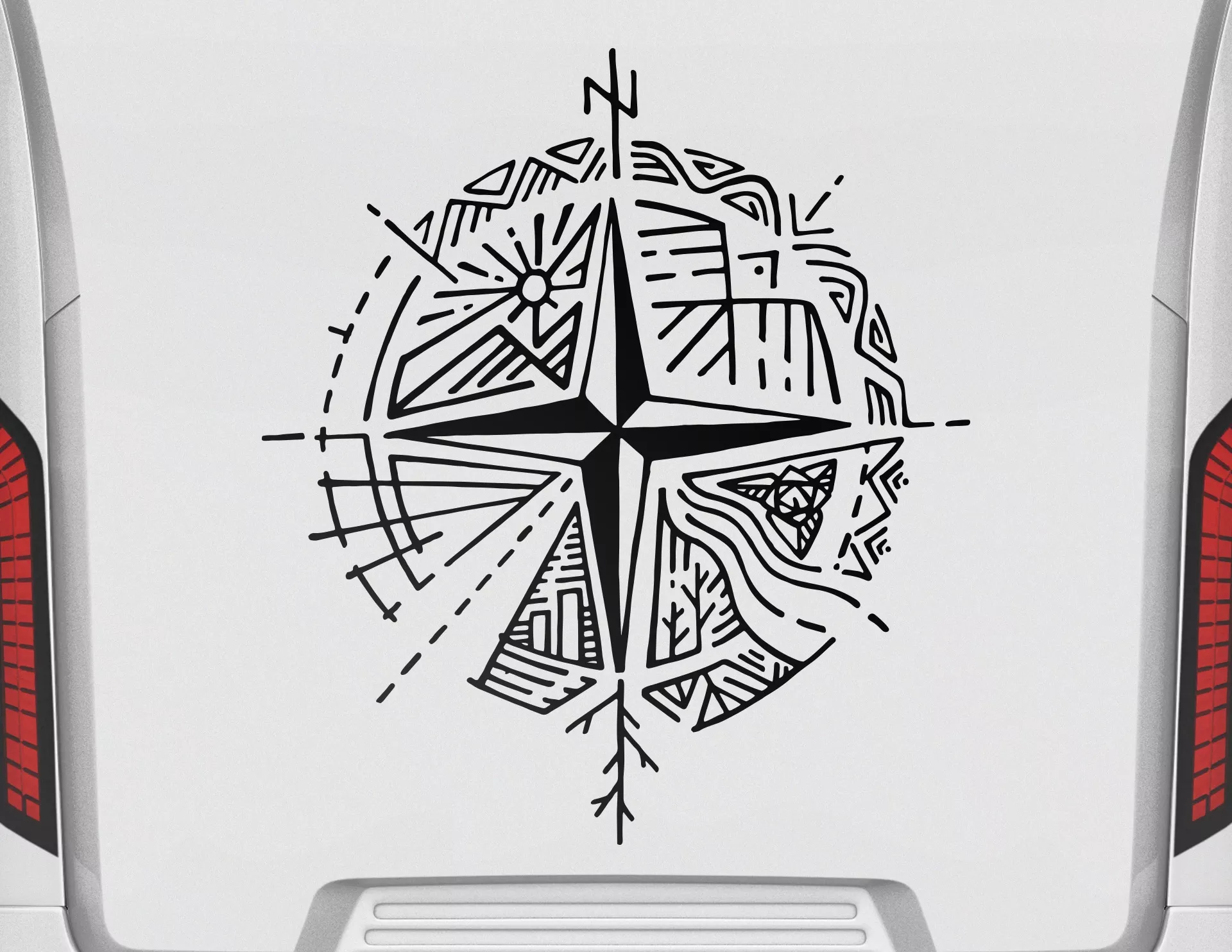 Entdecke die Welt auf Deine Art! Der Autoaufkleber Abstrakter Welten-Kompass ist Dein perfekter Begleiter. Er verbindet Elemente der Natur, wie Berge und Sonne, mit geometrischen Mustern zu einem außergewöhnlichen Design.