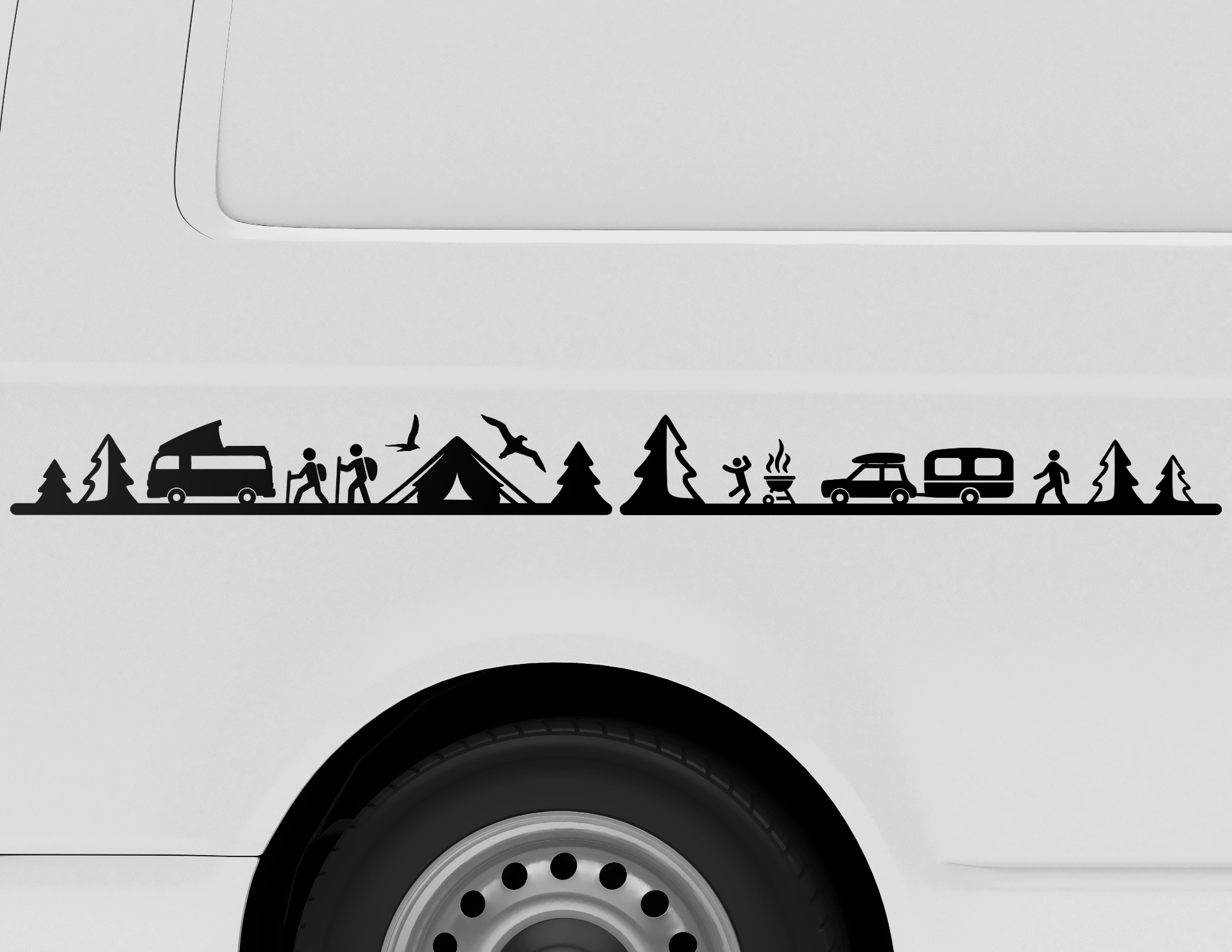 Camping-Leben in zwei Teilen: Diese beiden Motiv-Streifen kannst Du in einer Reihe, oder getrennt voneinander verkleben. Wie auch immer Du Dich entscheidest; der Autoaufkleber „Camping Life“ im Piktogram-Stil macht einfach Lust auf unbeschwertes Reisen, Wandern und das Abenteuer Wildnis.