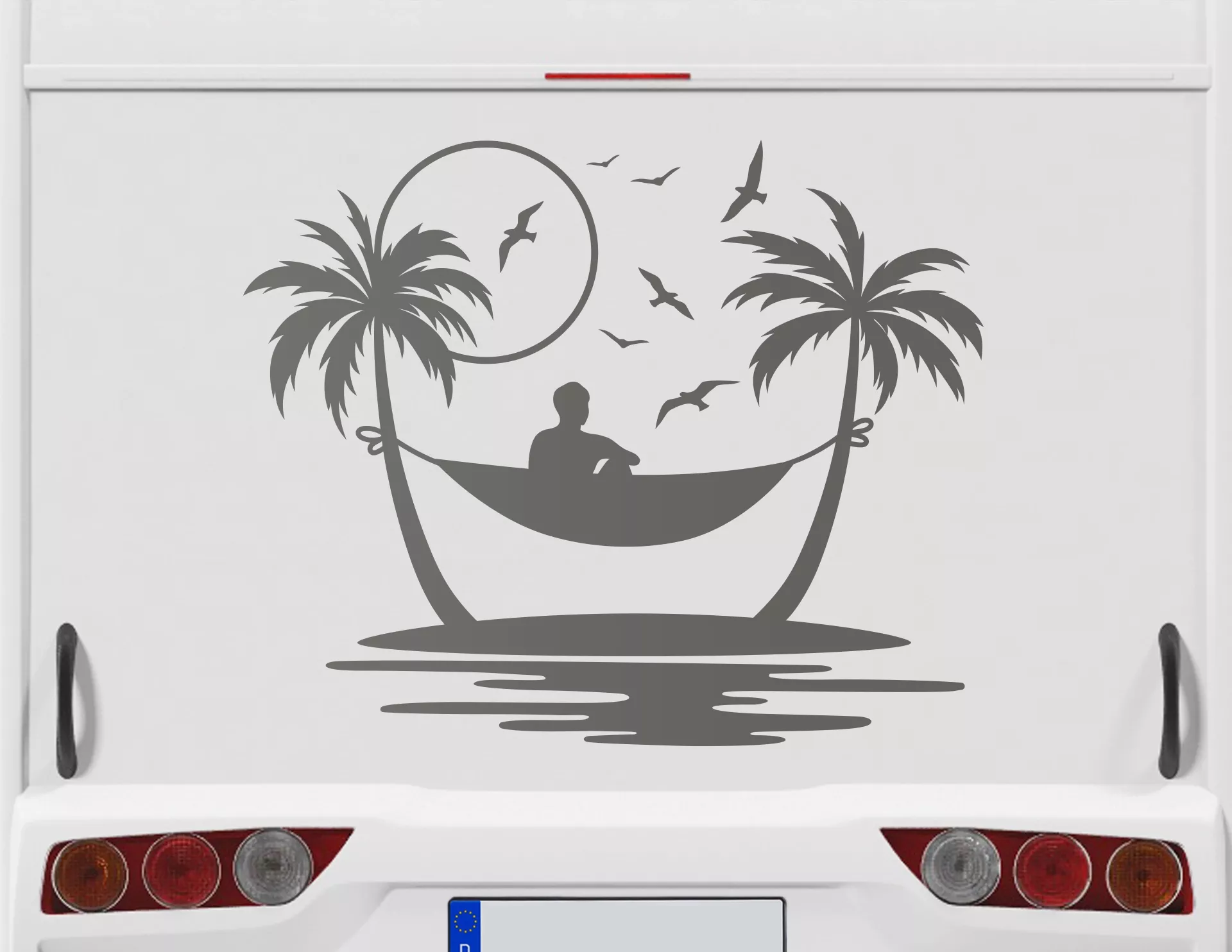 Ein Urlaubsmotiv zum Aufkleben für Wohnwagen, Caravan, Bus & Co. Mit Strand, Meer, strahlender Sonne und vielen Möwen: Autoaufkleber Hängematte unter Palmen. So sieht Erholung aus …in der Hängematte liegen, hohe Wellen bestaunen, die warme Sonne genießen, relaxen und von fernen Sehnsuchtsorten träumen. Dazu muss man nicht gleich in die Tropen reisen. Einfach Sachen packen und in Richtung Küste zum Camping fahren.