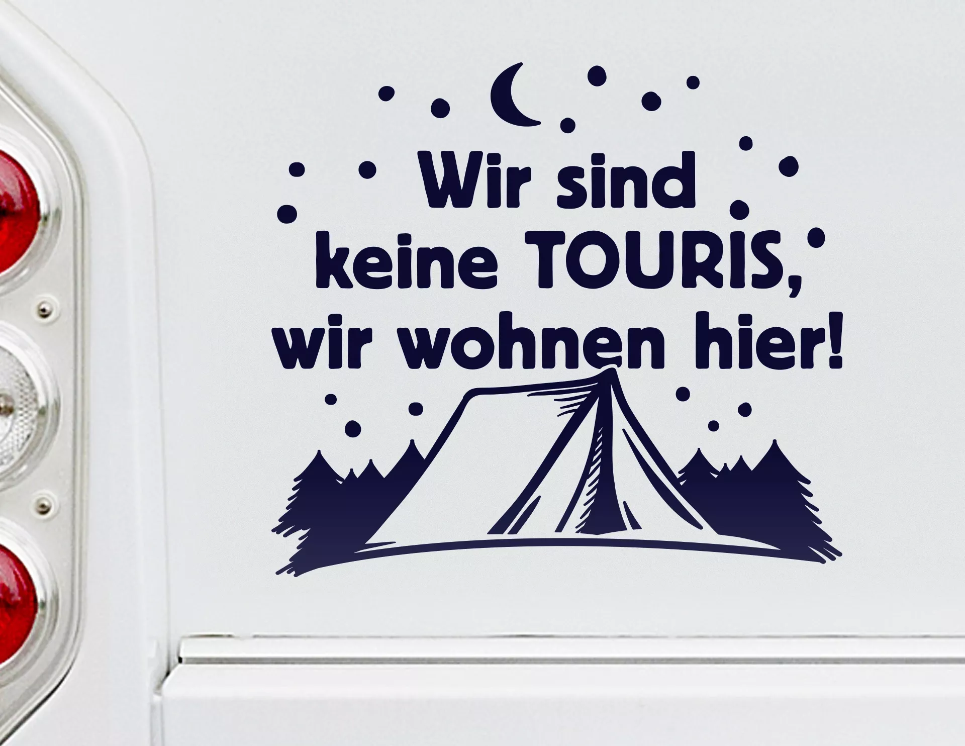 Dieser lustige Spruch dürfte allen Campern aus dem Herzen sprechen: "Wir sind keine Touris, wir wohnen hier!" Als Autosticker macht er auf Caravan oder Wohnwagen klar, dass hier keine einfachen Touristen unterwegs sind, sondern Naturfreunde mit dem Wunsch, die Umgebung ehrlich und authentisch kennen zu lernen. Das Camping-Motiv mit Zelt unterm Sternenhimmel, Mond und Tannenwald ist zudem ein echter Hingucker und sorgt für ein breites Grinsen im Gesicht.