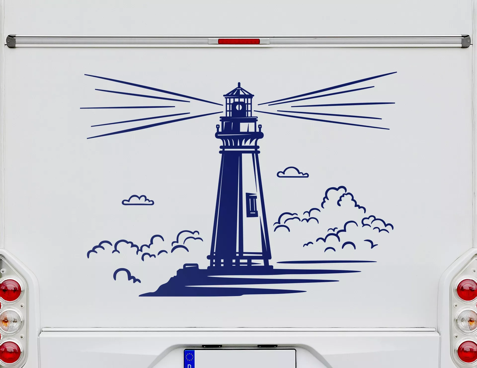Ein maritimes Motiv für Wohnwagen, Camper, Bus oder Van der Lust macht auf eine Ausfahrt an die Küste zu Strand, Wasser und Mee(h)r – Autoaufkleber Leuchtturm am Pier.