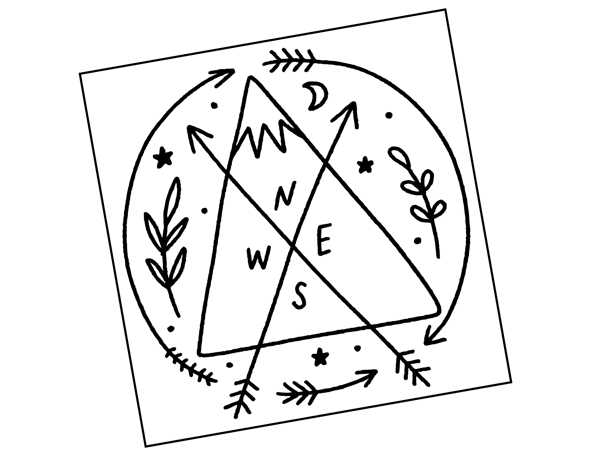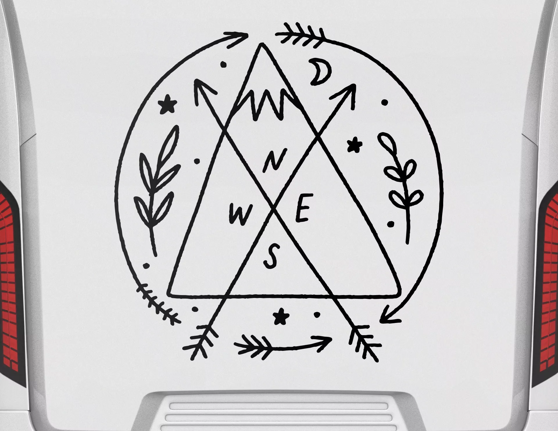 Dein Navigator durch die Untiefen des Caravan-Lebens - Autoaufkleber Pathfinder's Pride! Ein handgezeichnetes Motiv mit Bergspitze, Kompass, zwei Pfeilen und floralen Elementen in einem harmonischen Kreis vereint.