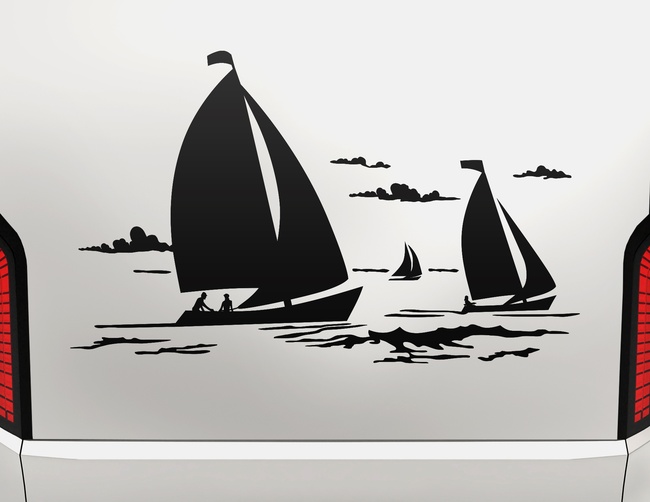 Sommerurlaub am Meer, am Strand bummeln und im Hafen auf ein Fischbrötchen. Dabei die flotten Segelboote beobachten, das könnte dieser Autoaufkleber darstellen. Die Segelregatta macht Lust auf die See und das Wasser, und mit Caravan oder Wohnwagen ist man ganz dicht dran. Der Sticker zeigt drei Segelboote mit Seglern, die auf den Wellen um die Wette fahren. Die Wolken am Horizont schaffen ein zusätzliches maritimes Panorama – die perfekte Idylle für jedes Campermobil.