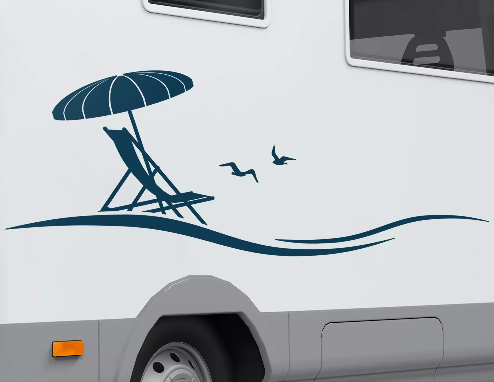 Unser Autoaufkleber Sommer Sonnenbad mit Liegestühlen, Möwen und Sonnenschirmen ist eine stimmungsvolle Dekoration für Caravan, Bus oder Wohnwagen und weckt jetzt schon die Vorfreude auf viele spannende Urlaubsabenteuer… Gute Reise!