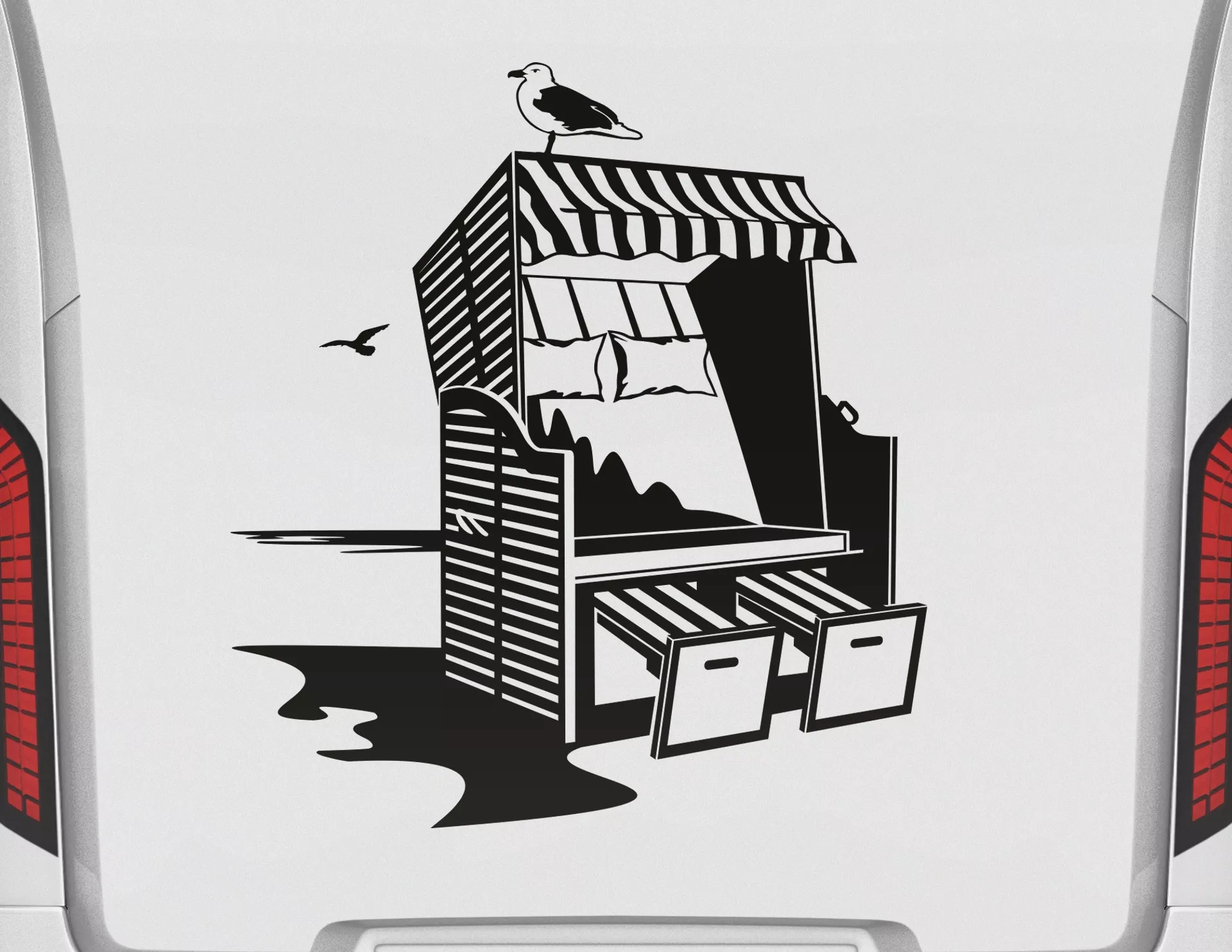 Chillen am Meer, windgeschützt und der Sonne entgegen? Da muss ein Strandkorb im Spiel sein! Ob Ostsee, Nordsee oder Baggersee – ein Strandkorb sorgt immer für die richtige Urlaubsstimmung. Als großformatiger Autoaufkleber setzt er diese Stimmung auf Deinem Reisemobil in Szene und macht Lust auf Urlaub. Der Strandkorb kommt komplett mit ausgefahrenen Fußstützen, Meereshintergrund und zwei frechen Möwen, die mit ihren (imaginären) Schreien das Strandgefühl vervollständigen.