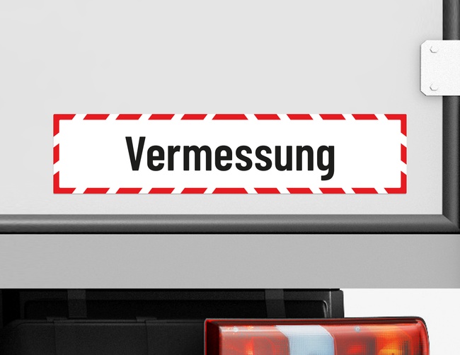 Vermessungsarbeiten können im Straßenverkehr unerwartete Situationen auslösen und bergen gewisse Gefahren. Um andere Verkehrsteilnehmer rechtzeitig zu warnen, raten wir zur Nutzung des Autoaufklebers Vermessung am Fahrzeugheck.