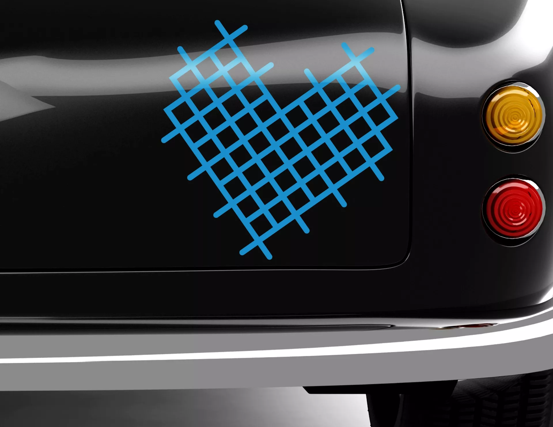 So schön wie handgestickt: „Cross-Stitch Heart“. Dieser Autoaufkleber verbindet traditionelle Handwerkskunst mit modernem Design.