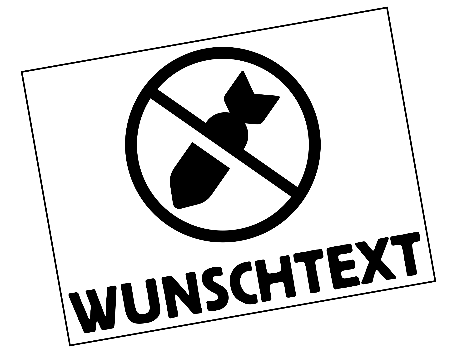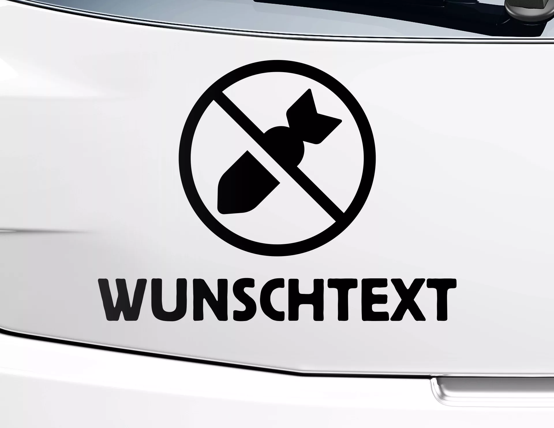 Aus Krisen werden Kriege, Bomben und Raketen bedrohen die Bevölkerung. Das darf nicht sein! Ein deutliches Zeichen gegen Hass, Krieg und Gewalt setzt dieser Aufkleber plus Wunschtext für Autos. Die durchgestrichene Bombe samt Schriftzug "Gegen Krieg!" zeigt nicht nur beim Friedensumzug die eigene pazifistische Einstellung, sondern auch bei allen täglichen Fahrten.