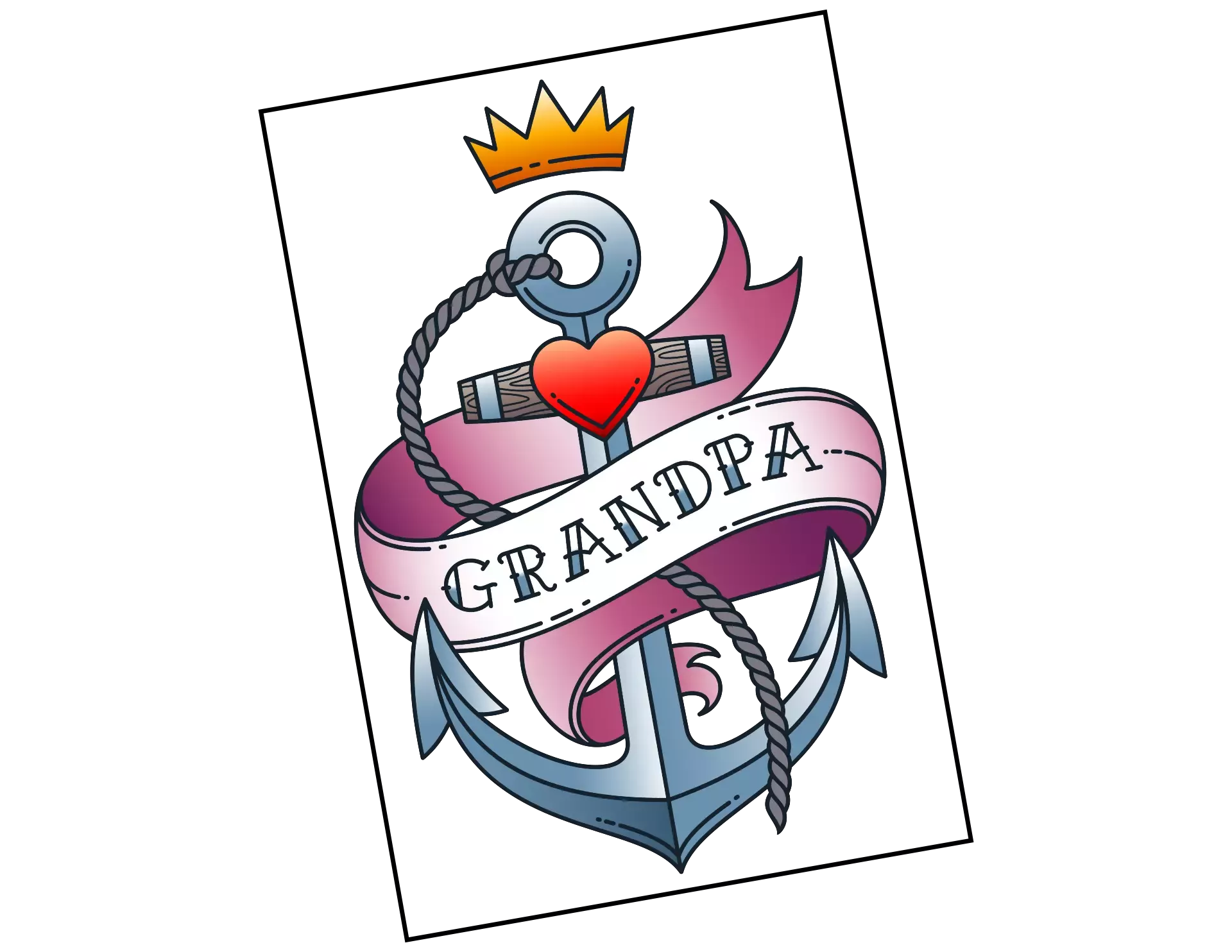Opa an Bord? Nein, dieser Design-Aufkleber zeigt, dass Großvater auf seinen Nachwuchs stolz ist. Damit es auch schön auffällt, wird der Schriftzug "Grandpa" von einem Anker samt Spruchband, Tau, Schiffsplanke, Herzchen und Krone umrahmt – ganz im Stile des bekannten maritimen Tattoo-Klassikers.