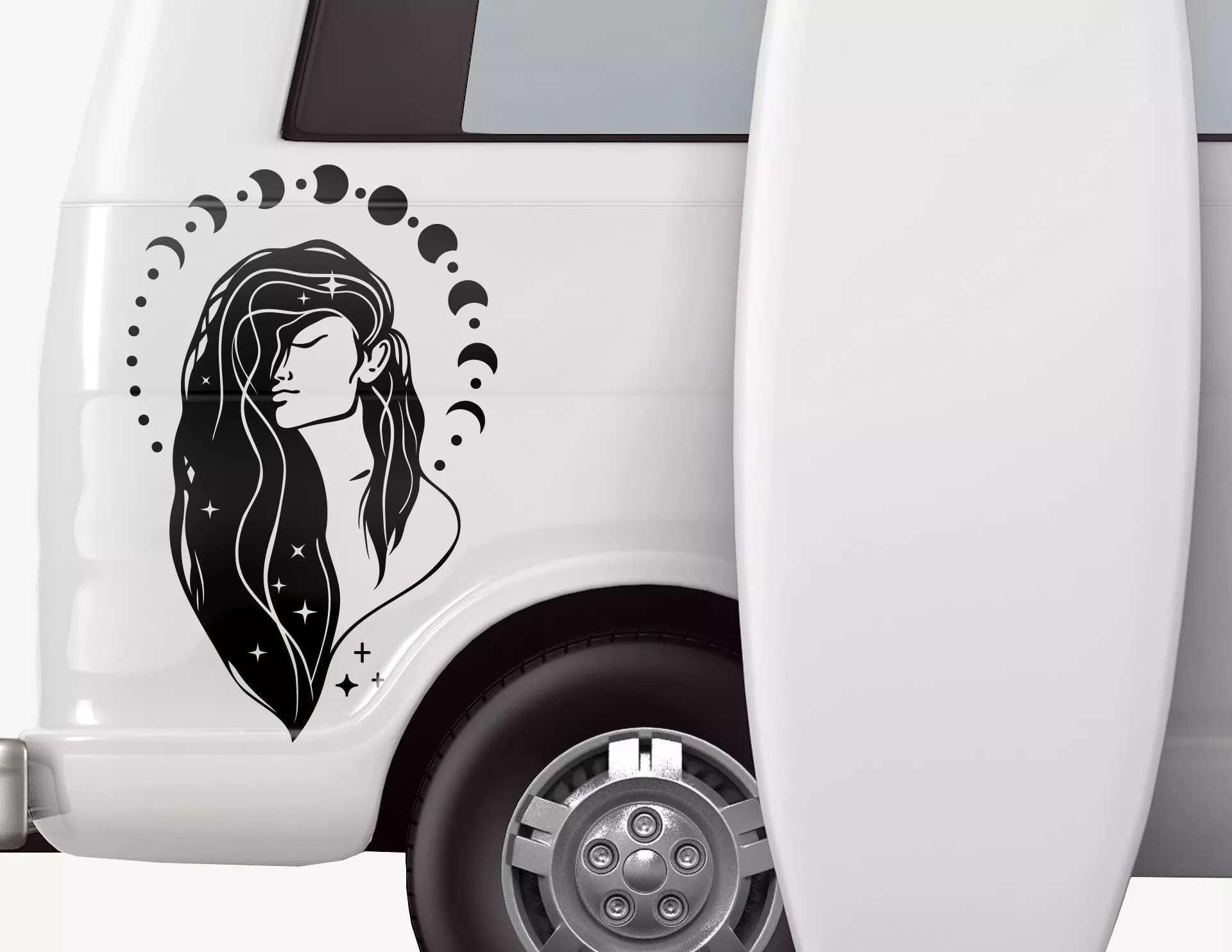 Geheimnisvoll und sinnlich: Autoaufkleber Moonchild Goddess mit einer Schönheit im Boho-Look samt Mondphasen, Sternen und Planeten.