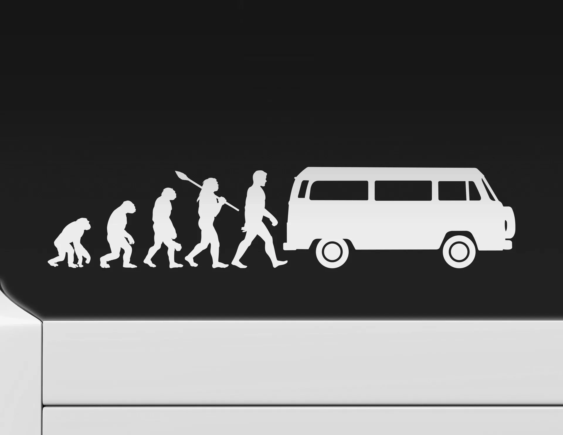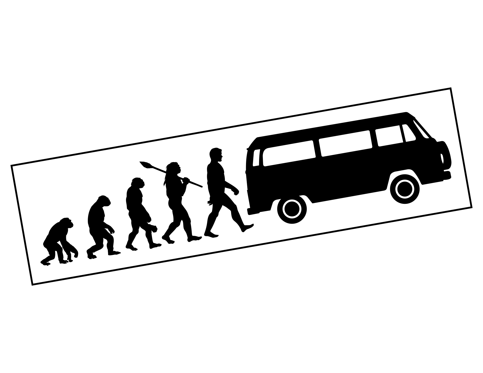 Echter Fortschritt: Autoaufkleber Bully Evolution mit der etwas anderen Evolutionstheorie. Für nostalgische Campingfreunde, happy Hippies und waschechte Bully-Fans.