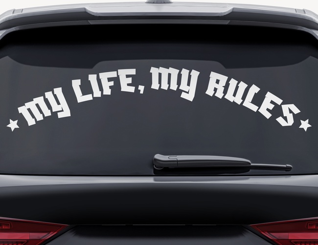 Die Message könnte klarer nicht sein: Mein Leben, meine Regeln. Damit es auch wirklich alle verstehen, kommt dieses prägnante im Bogen gestaltete Text-Design für die Heckscheibe auf Englisch – My Life, My Rules. Jetzt sollten wirklich alle Fragen beantwortet sein und Du hast, davon ist bei diesem Autoaufkleber auszugehen, Deine Ruhe. Punkt!