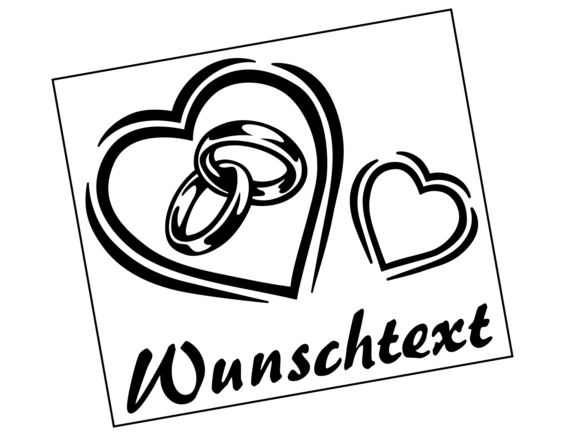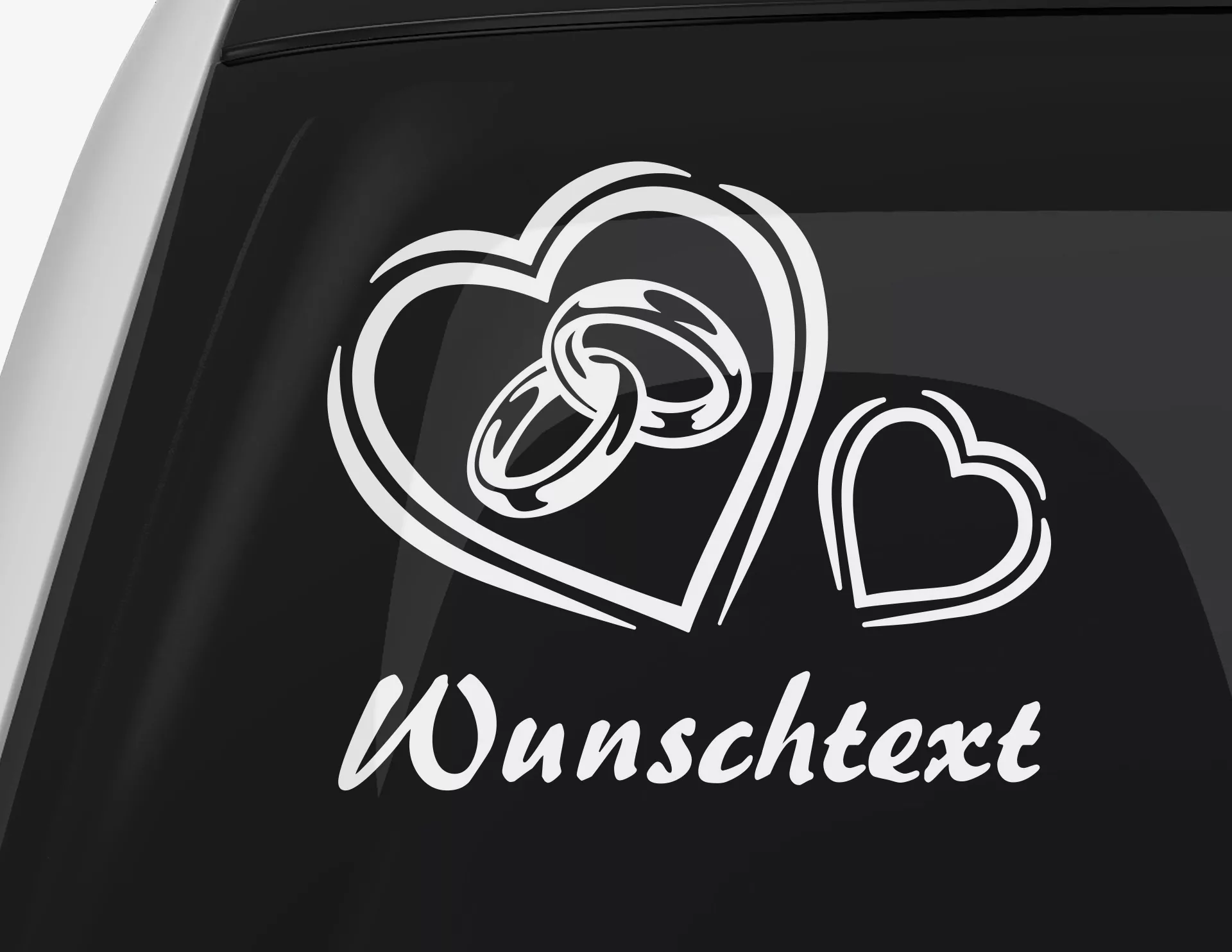 Hochzeitsaufkleber Ringe der Herzen: Eine liebevolle Deko für frisch verheiratete Brautpaare. Als Heckscheibenaufkleber oder für alle Lackflächen, mit Trauringen, zwei Herzen und Deinem persönlichen Wunschtext.