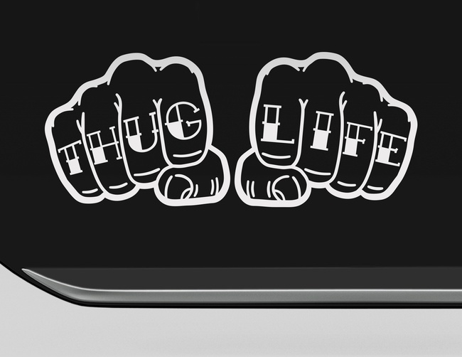 Für alle Thugs gibts diesen Sticker für Autos, der zwei tätowierte Fäuste zeigt. Auf den vier Fingern der linken und rechten Hand sind die Buchstaben THUG LIFE verewigt, was übersetzt so viel wie Gangster/Schläger -Leben bedeutet.