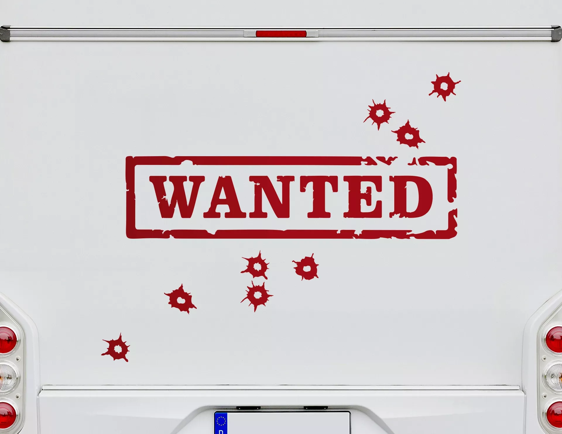 Wer einen Hauch Wild West-Feeling auf den Camper bringen möchte, kann diesen Wanted-Sticker auf's Heck kleben. Es müssen ja nicht Bonnie und Clyde an Bord sein oder eine aktive Fahndung laufen, aber witzig ist der Wanted-Aufkleber für Wohnmobile oder Caravans allemal. Dazu gibt es acht Einschusslöcher zum Aufkleben, die zu einer erfolgreichen Flucht natürlich dazugehören. Diese können nach Wunsch auf dem Fahrzeug positioniert werden. Aber statt Strafe und Knast fahren wir lieber zum nächsten Campingplatz und erholen uns von den Strapazen der Flucht, oder?!