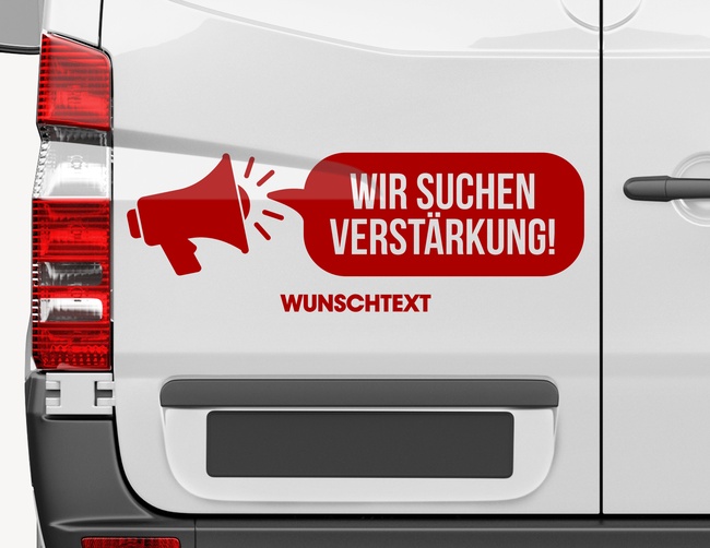 Mach Dein Gewerbe-Fahrzeug zur rollenden Jobbörse mit unserem Autoaufkleber: Wir suchen Verstärkung Megaphone. Ein echter Blickfang, der Deine Jobangebote direkt auf die Straße bringt.
