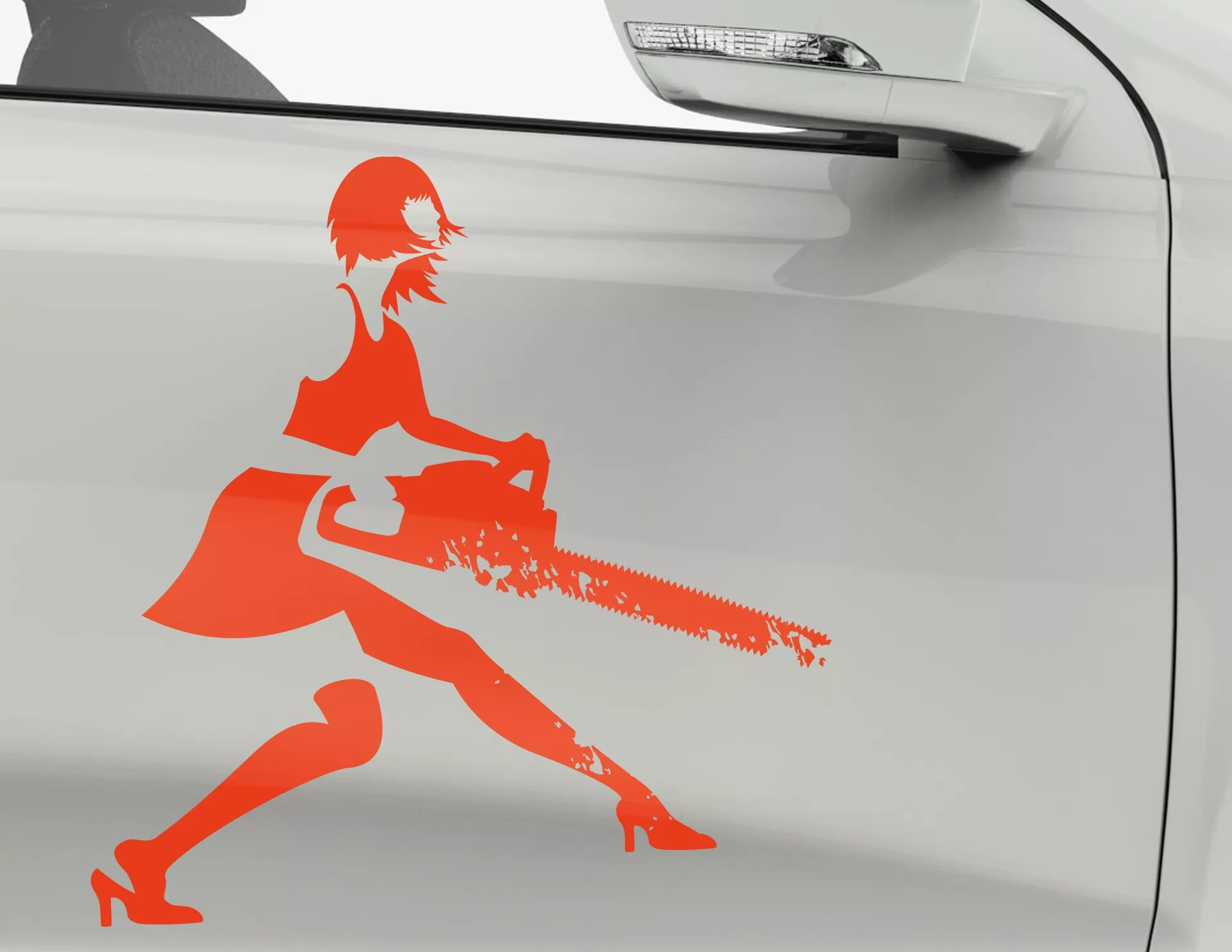 Straight und sexy: Amaya Amoky macht keine halben Sachen - höchstens mit Ihrer Kettensäge. Dieser Autoaufkleber ist genau das richtige Mittel gegen Stress.