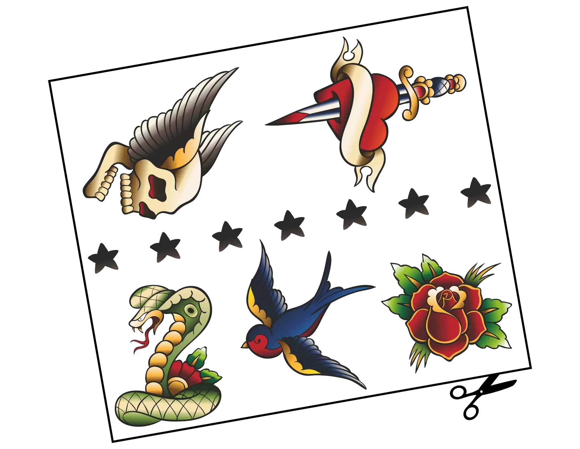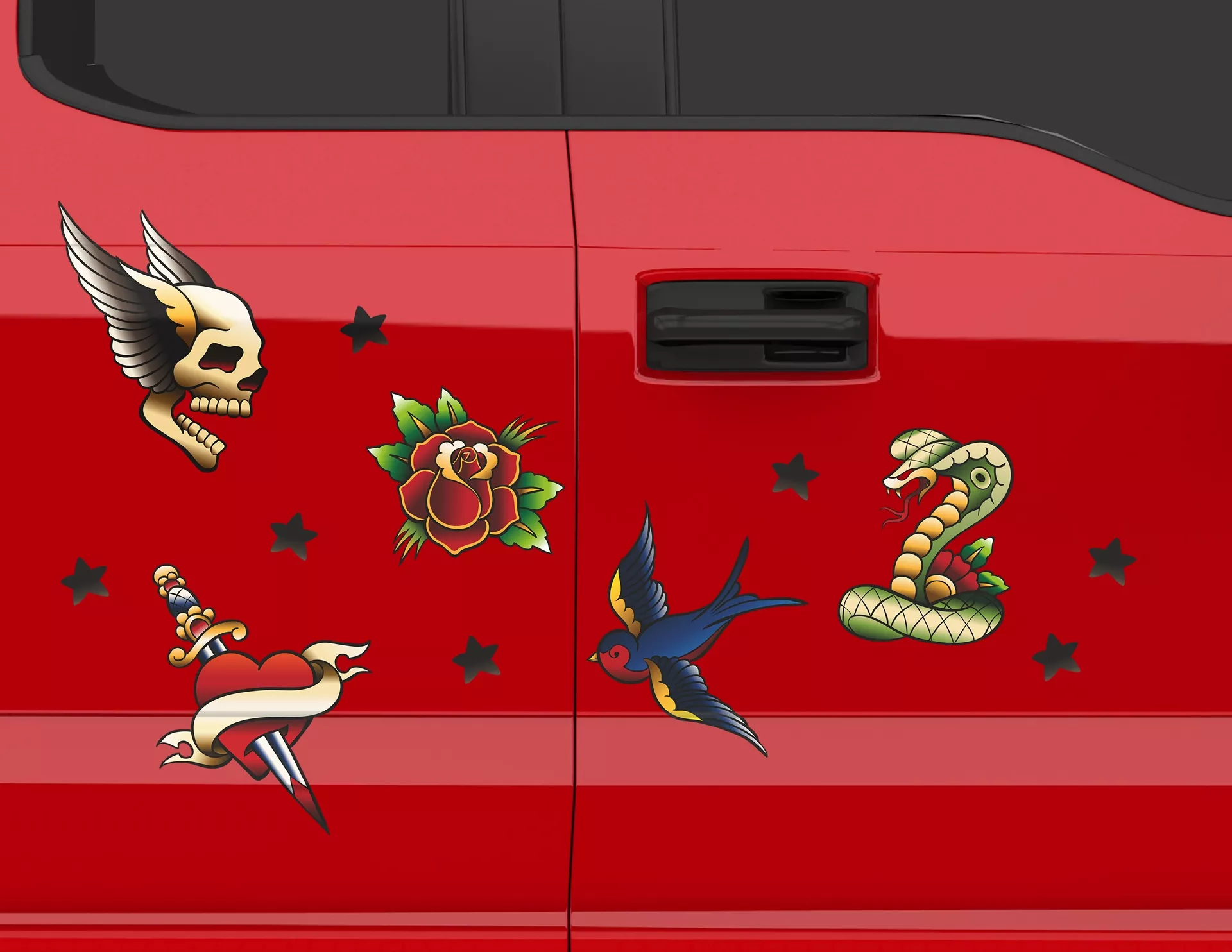 Vintage ist Trumpf! Mini-Tattoos liegen voll im Trend, denn sie verbreiten ganz unaufdringlich ihren traditionsreichen Charme und lassen sich selbst auf die kleinste Fläche stechen. Und genau das ist es wohl auch, was unseren Autoaufkleber "Classic Tattoo Vonda" so einzigartig, kreativ & schön macht. Es vereinen sich acht Motiv-Klassiker, bestehend aus Flügel, Herz, Rose, Schädel, Schlange, Schwalbe, Dolch und Stern – frei platziert, zu einem echten Hingucker auf Deinem Wagen.