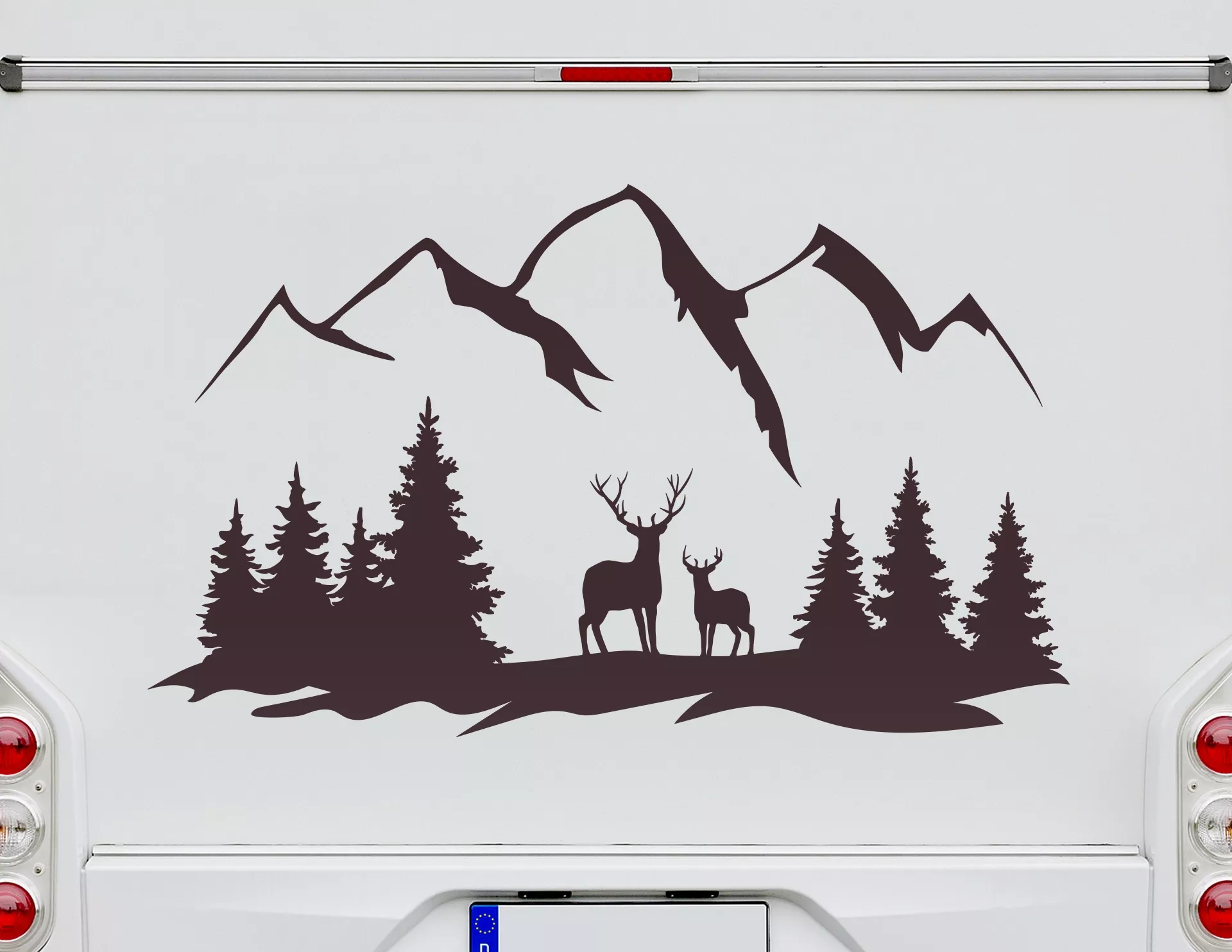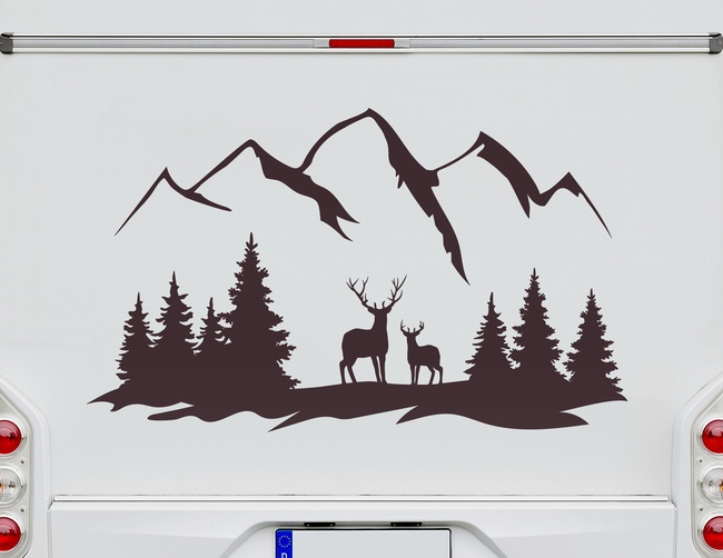 Natur erleben: Wir fahren nicht in die Natur, um dort denselben Luxus zu haben wie daheim. Camper suchen das Abenteuer und den Kontakt mit der Wildnis. Der Autoaufkleber Deer Mountains illustriert eben diese Begegnung zwischen Mensch und Wild – hier in schönstem Berg-Panorama.