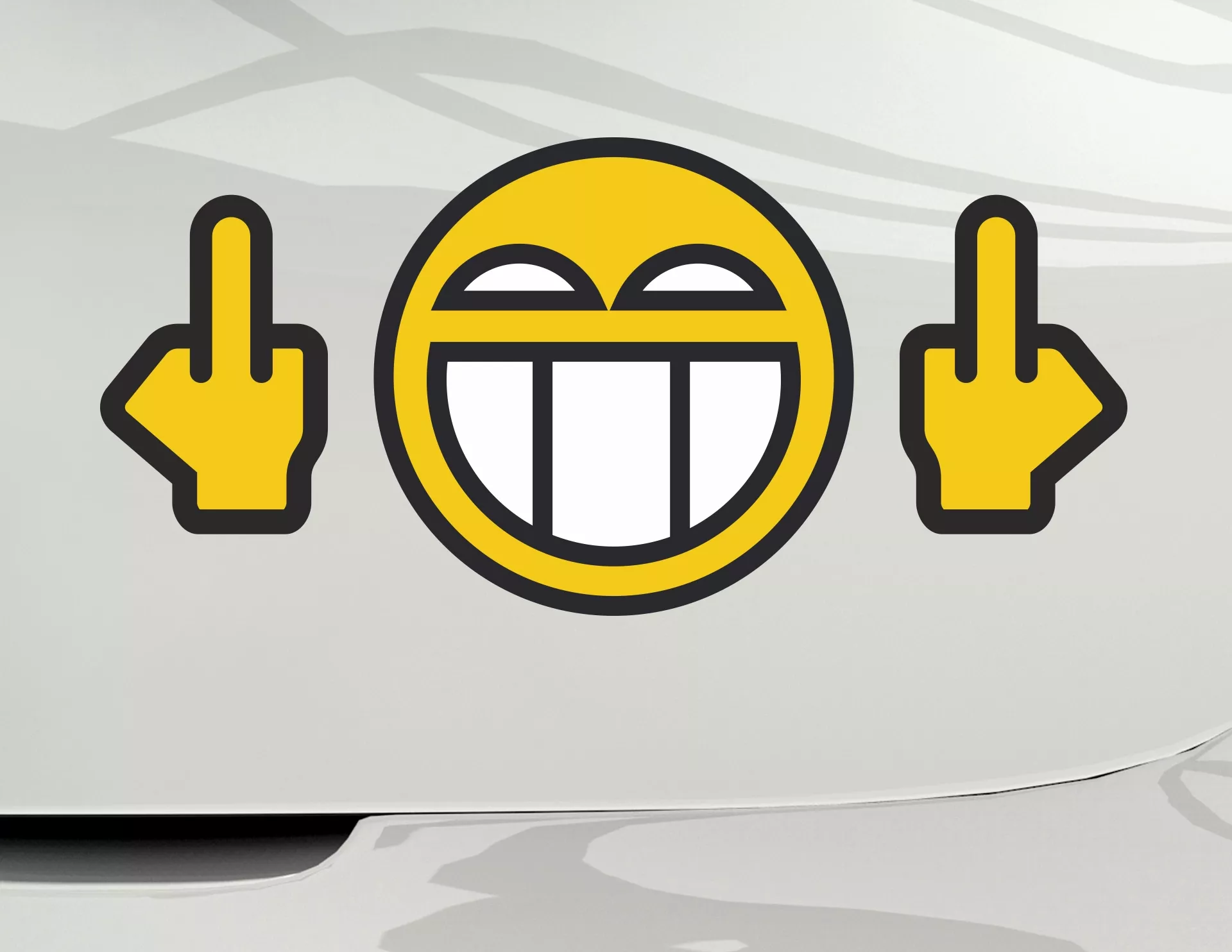Der F**k Off Smiley mit seinen beiden Mittelfingern macht sich deshalb perfekt z.B. auf der Heckscheibe, der Stoßstange, der Heckklappe oder den Türen. Einfach aufkleben und Dein 'Statement' unmissverständlich setzen! – Autoaufkleber "FO Smiley"
