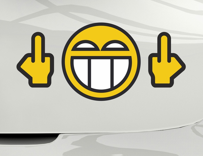 Was wolltest Du dem Autofahrer hinter Dir schon immer mal sagen? Dieser coole Emoji-Aufkleber drückt genau das aus, was viele von uns im Straßenverkehr denken. Der F**k Off Smiley mit seinen beiden Mittelfingern macht sich deshalb perfekt z.B. auf der Heckscheibe, der Stoßstange, der Heckklappe oder den Türen. Einfach aufkleben und Dein 'Statement' unmissverständlich setzen! – Autoaufkleber "FO Smiley"