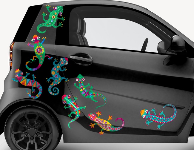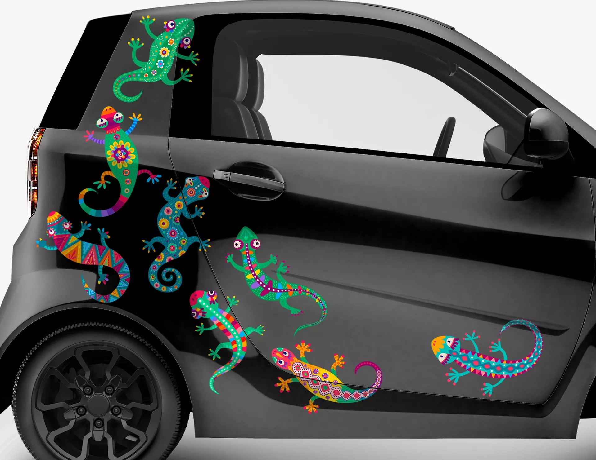 Exotischer Musterrausch: Die bunten Geckos vom Autoaufkleber Funky Lizard sind eine bunte DIY-Idee für jedes Auto. Ob Türen, Heckscheibe oder Motorhaube diese lustigen Echsen machen einfach gute Laune.