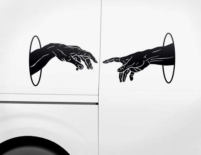 Mut zur Lücke! (Fahrzeug)Kultur in seiner reisten Form – mit diesem Autoaufkleber, in Anlehnung an Michelangelos Deckenfresko in der Sixtinische Kapelle „Die Erschaffung Adams“, findest Du wahre Erleuchtung ...und Riesenspaß beim Öffnen und Schließen Deiner (Schiebe)Tür.