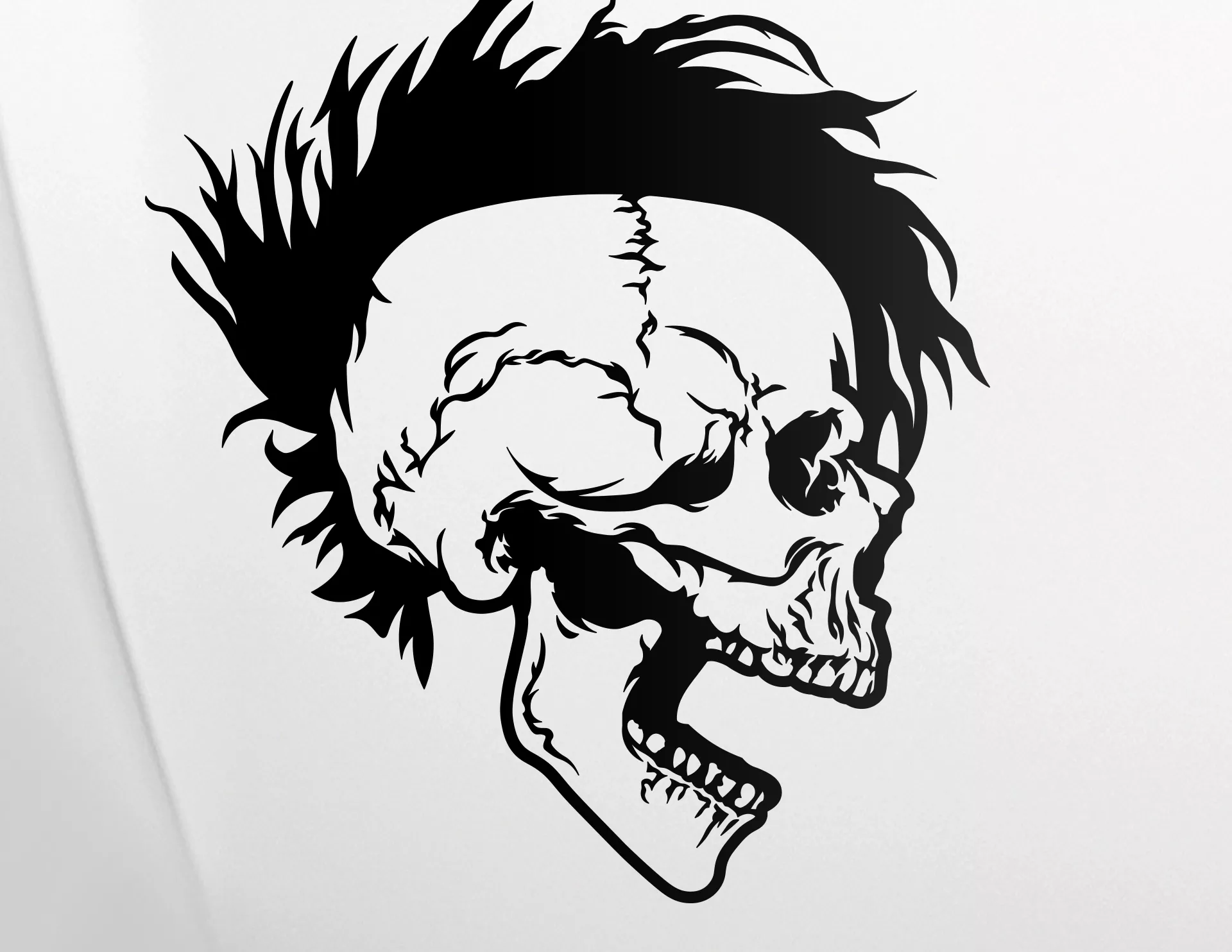 Anti-Held im Profil: Autoaufkleber Iro Skull Punk. Dieser Totenkopf mit Irokesen-Schnitt versteht sich als Bild gewordene Kampfansage ans Establishment, und Zeichen für Anarchie, Freiheit und Spaß.